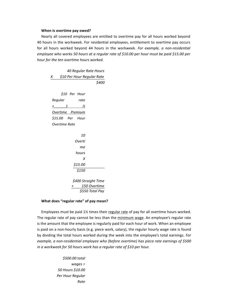 在所有加班时间内,员工必须支付其正常工资的1.5倍。正常的工资率不能低于最低工资。员工的正常费率是员工每工作一小时定期支付的金额。当员工不按小时支付时(例如工件,工资),通过将一周工作总时间除以员工总收入找到常规小时工资率。例如,一个非加班员工(在加班之前)在工作周内工作时间为50小时的计件工资收入为500美元,每小时工资为10美元。