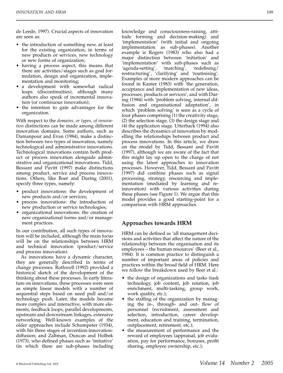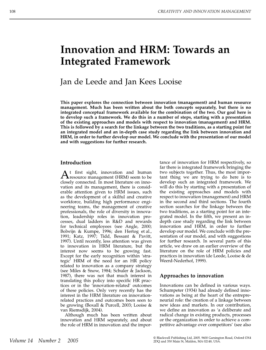首先,创新与人力资源管理(HRM)似乎紧密相连。在大多数关于创新和创新管理的文献中,人们对人力资源管理问题给予了相当大的关注,比如培养一支高技术的创造性劳动力队伍、建立高绩效的工程团队、创造性专业人员的管理、多样化在创新中的作用、在创新过程中的领导者角色、研发的双梯队和对技术员工的奖励 (参见 Angle, 2000; Bolwijn amp; Kumpe, 1996; den Hertog et al., 1991; Katz, 1997; Tidd, Bessant amp; Pavitt, 1997)。直到最近,人力资源管理文献中对创新的关注仍然不多,但呈现出快速增长趋势。除了在“人力资源管理”领域早期,认识到要把与创新相关的人力资源政策作为公司战略之外(参见 Miles amp; Snow, 1984; Schuler amp; Jackson, 1987),要将此政策转化为具体的人力资源实践或这些政策的相关创新实践。直到最近,关于创新实践和创新成果的人力资源管理文献研究越来越多 (Boxall amp; Purcell, 2003; Looise amp; van Riemsdijk, 2004)。
