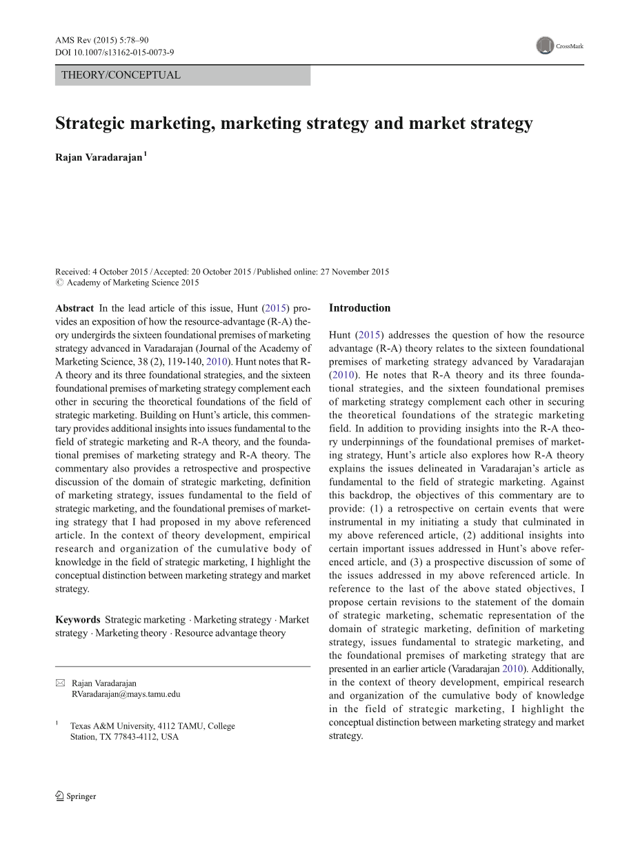 亨特(2015)解决了资源优势(R- A)理论如何与ValADARAJAN(2010)提出的营销战略的十六个基本前提有关的问题。他指出,R—A理论及其三种基础战略和十六种营销策略的基本前提在战略营销领域的理论基础上相辅相成。除了提供对市场营销战略的基本前提的理论基础的洞察力之外,Hunt的文章还探讨了R—A理论是如何解释瓦拉达伦文章中所描述的问题作为战略营销领域的基础的。在这一背景下,本次评论的目的是:(1)对某些事件的回顾,这有助于我发起一项研究,在我上面提到的文章中达到高潮,(2)对Hunt上面提到的一些重要问题的补充见解。(3)对我上面提到的文章中的一些问题进行了前瞻性的讨论。参考上述目标的最后一点,我提出对战略营销领域的陈述、战略营销领域的示意性表示、营销战略的定义、战略营销的基本问题和基础。在早期文章(ValADARAAN 2010)中提出的营销策略的前提。此外,在理论发展,实证研究和组织的知识积累领域的战略营销的背景下,我强调的概念区分营销战略和市场战略。
