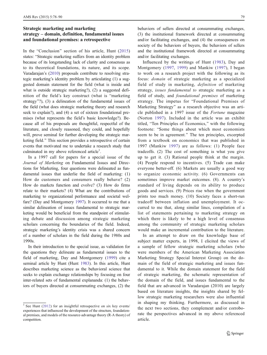 在他们对特殊问题的介绍中,作为对市场营销领域的基本问题的验证,《天》和Montgomery(1999)引用了Hunt(亨特1983)的一篇开创性文章。在这篇文章中,Hunt将营销科学描述为行为科学,试图通过关注四个相互关联的基本解释集来解释交易关系:(1)以完善交流为导向的买方行为;(2)卖方在完善交易中的行为 (3)旨在完善和/或促进交易所的制度框架,以及(4)买方行为、卖方行为和以完善和/或促进交易所为导向的制度框架对社会的影响。 受亨特(1983)、天和Montgomery(1997, 1999)和曼昆(1997)著作的影响,我开始从事一个研究项目,其重点是:战略营销领域作为一个专门的市场研究领域,营销战略的定义,基本问题。战略营销作为一个研究领域,是营销战略的基本前提。基础设施的动力 作为一个研究目标的营销策略 CLE发表在《财富》杂志(诺顿1997)的1997期杂志上。这篇文章中包含了一个名为BTEN经济学原理的展览,下面是脚注:一些经济学家似乎同意的一些事情。 在1997出版的经济学教科书中(曼昆1997)如下:(1)人们面临权衡取舍。(2)某事的成本是你为了得到它而放弃的东西。(3)理性的人在边际上思考。 (4)人们对激励做出反应。(5)贸易可以使每个人富裕起来。(6)市场通常是组织经济活动的好方法。(6)政府有时可以改善市场结果。(8)。一个国家的生活水平取决于其生产商品和服务的能力。(9)政府发行过多货币时物价上涨。(10)社会面临通货膨胀与失业之间的短期权衡。它也使我明白,沿着类似的路线,汇编有关市场营销策略的报表清单,在战略营销学者的社区中很可能有很高的一致性,这将对文献作出增量贡献。 为了借鉴主题专家的知识基础,在1998,我提出了战略营销学者(谁是美国营销协会营销战略特殊利益集团的成员)的一个样本的观点。集成电路的营销和问题是至关重要的。虽然战略营销领域的领域陈述、领域领域的示意性表示和ValADARAJAN(2010)中所提出的领域的基本问题主要基于文献洞察力,FEL -低策略市场所共享的见解。ING研究人员也影响了我的思维。此外,正如下面两部分所讨论的,它们补充和/或对我上面引用的文章中提出的观点进行了评价。