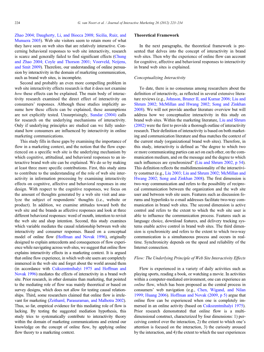 Hoffman和Novak(1996)提出的在线流量概念模型表明,流量在跨网站导航时调解交互效应。目前的研究使用这种通用模型来解决特定网站上的流量体验并将其应用于商业环境。先前的实证研究指出流量的中介作用主要集中在网络导航(例如Novak,Hoffman和Yung 2000)以及诸如博客和即时消息等通信工具的使用(Chang and Wang 2008)。虽然一些研究人员在商业环境中主张网络流量的重要性(例如,黄2006),但其他人则认为在线流量与营销无关(Zeithaml,Parasuraman和Malhotra 2002)。到目前为止,这些索赔的经验证据是缺乏的。在目前的研究中,有人认为,在线流量调解了网站交互性和营销人员关注的反应之间的关系,如消费者生成的产品和网站想法,态度和行为反应。为了对消费者的在线流量体验进行调解,更高水平的网站交互性应该首先导致更加激烈的在线流体验,这将随后影响情感,认知和行为反应。首先,将讨论网站交互性和在线流之间的路径。其次,将探索在线流量与认知反应之间的路径,从而产生两种调解假设。第三,将调查在线流量与情感和行为反应之间的路径,从而产生这些类型反应的调解假设。