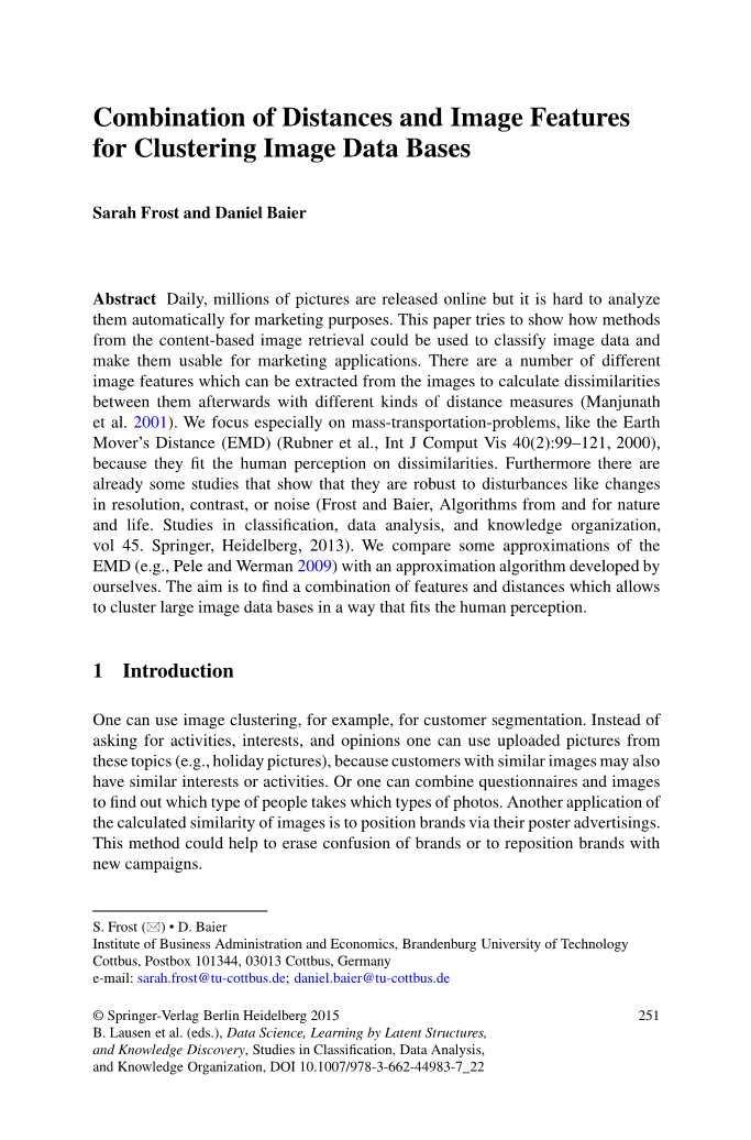 Abstract Daily, millions of pictures are released online but it is hard to analyze them automatically for marketing purposes. This paper tries to show how methods from the content-based image retrieval could be used to classify image data and make them usable for marketing applications. There are a number of different image features which can be extracted from the images to calculate dissimilarities between them afterwards with different kinds of distance measures (Manjunathet al. 2001). We focus especially on mass-transportation-problems, like the EarthMoverrsquo;s Distance (EMD) (Rubner et al., Int J Comput Vis 40(2):99–121, 2000),because they fit the human perception on dissimilarities.