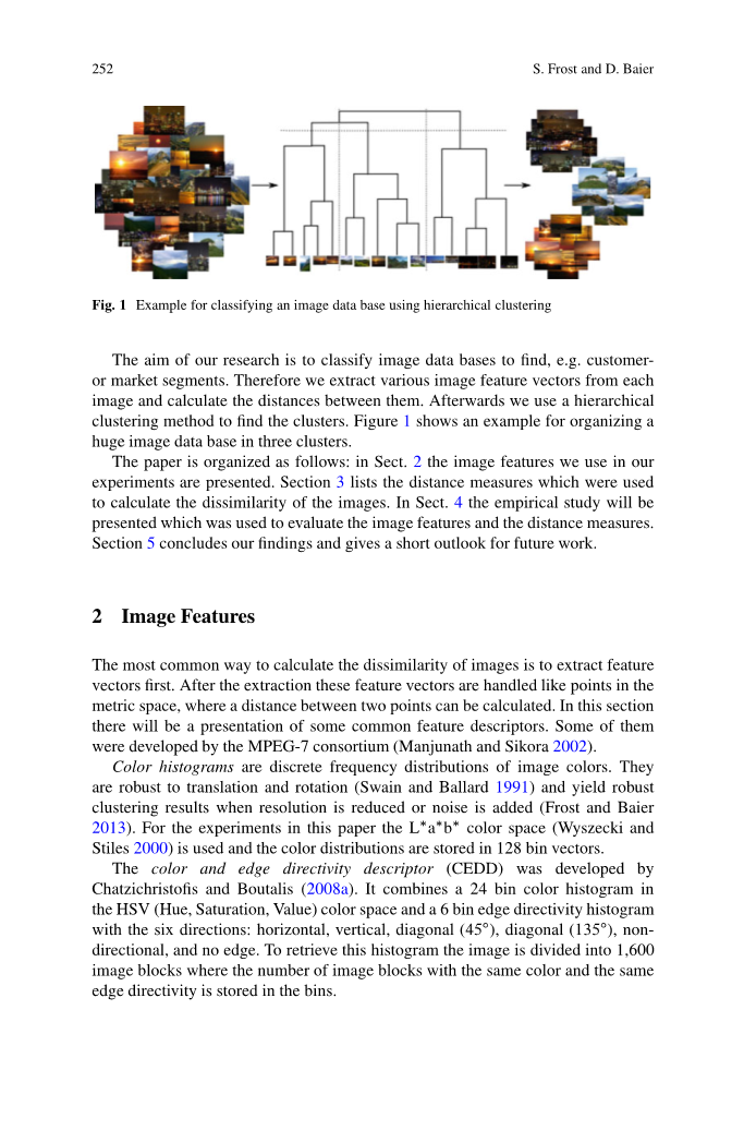 The paper is organized as follows: in Sect. 2 the image features we use in our experiments are presented. Section 3 lists the distance measures which were used to calculate the dissimilarity of the images. In Sect. 4 the empirical study will be presented which was used to evaluate the image features and the distance measures. Section 5 concludes our findings and gives a short outlook for future work.