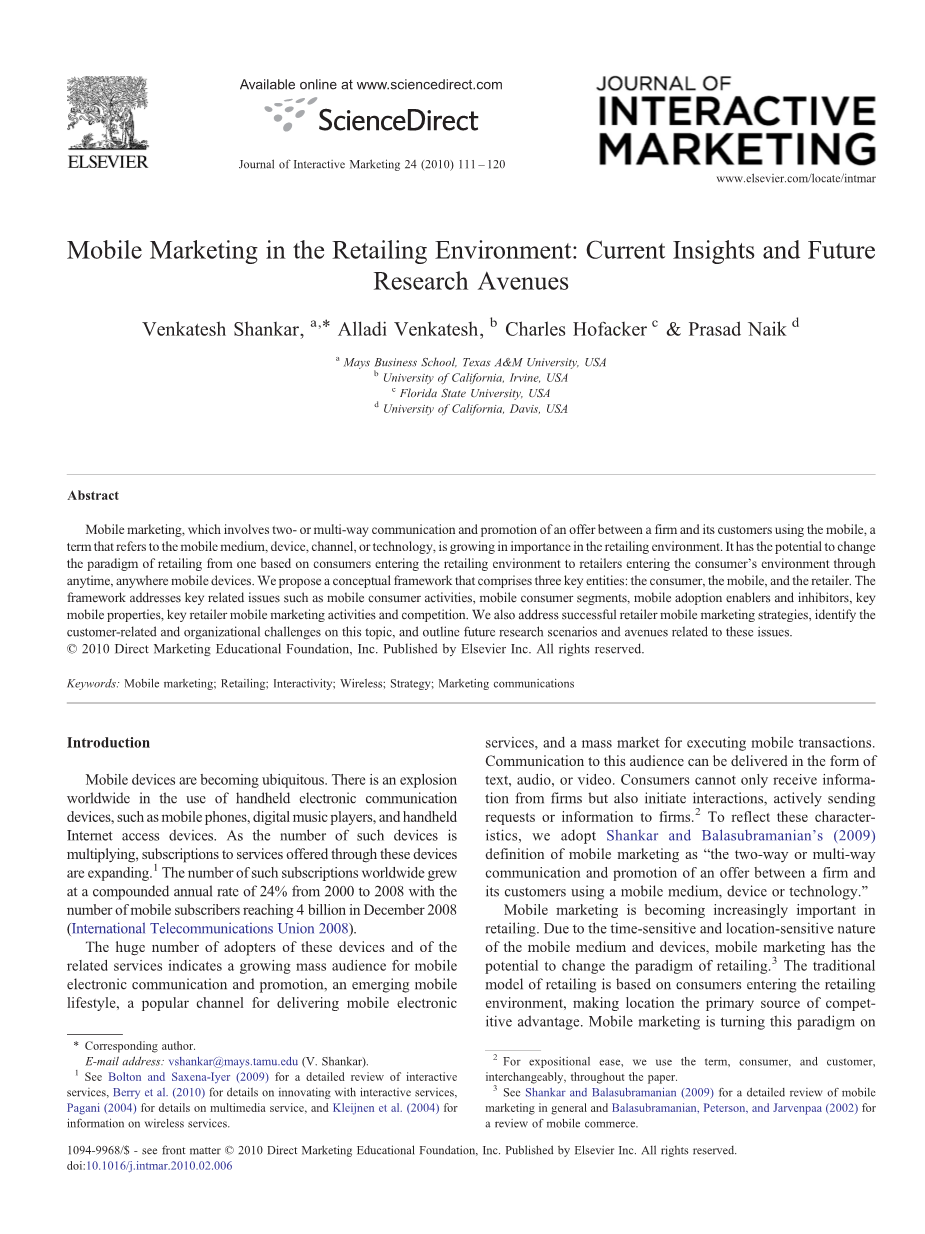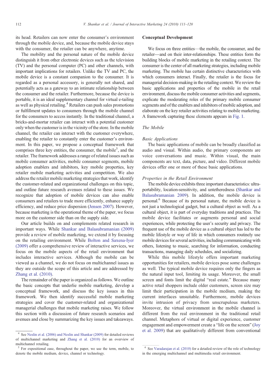 我们的文章以重要的方式构建和补充相关研究。虽然Shankar和Balasubramanian(2009)对移动营销进行了回顾,但我们将其重点放在零售环境上。虽然博尔顿和Saxena-Iyer(2009)对交互式服务进行了全面评估,但我们专注于零售环境的移动方面,其中包括交互式服务。虽然手机可以看作是一个渠道,但我们不关注多渠道问题,因为它们超出了本文的范围,并由Zhang等人提出。 (2010年)。