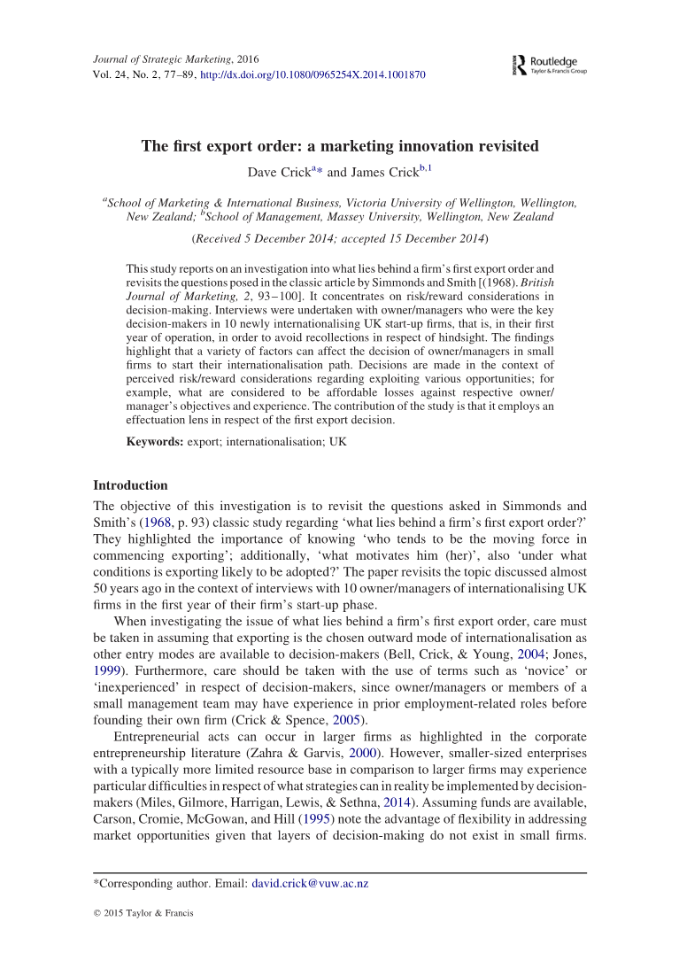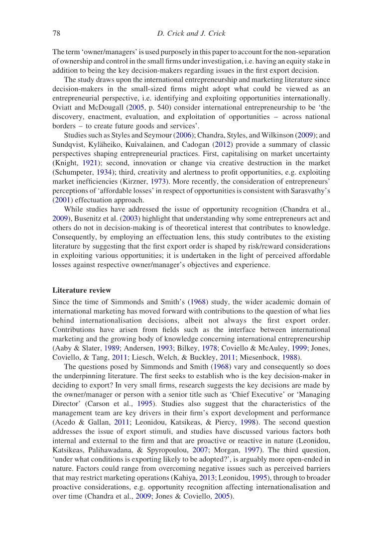When investigating the issue of what lies behind a firmrsquo;s first export order, care must be taken in assuming that exporting is the chosen outward mode of internationalisation as other entry modes are available to decision-makers (Bell, Crick, amp; Young, 2004; Jones, 1999). Furthermore, care should be taken with the use of terms such as lsquo;novicersquo; or lsquo;inexperiencedrsquo; in respect of decision-makers, since owner/managers or members of a small management team may have experience in prior employment-related roles before founding their own firm (Crick amp; Spence, 2005).