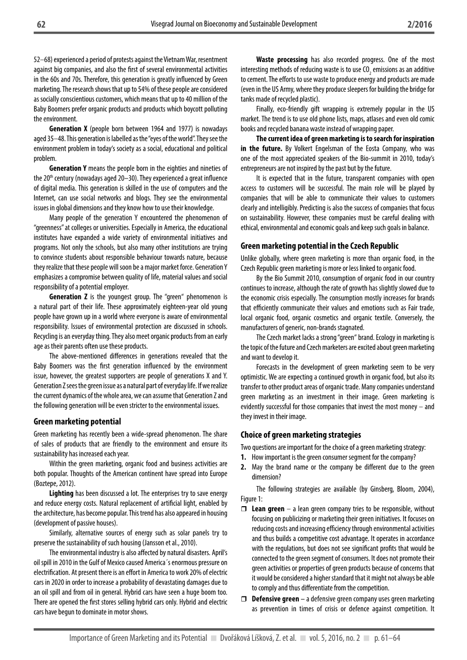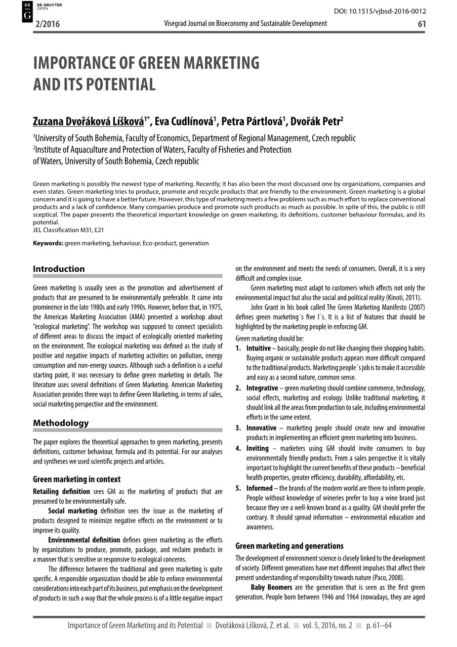The paper explores the theoretical approaches to green marketing, presents definitions, customer behaviour, formula and its potential. For our analyses and syntheses we used scientific projects and articles.