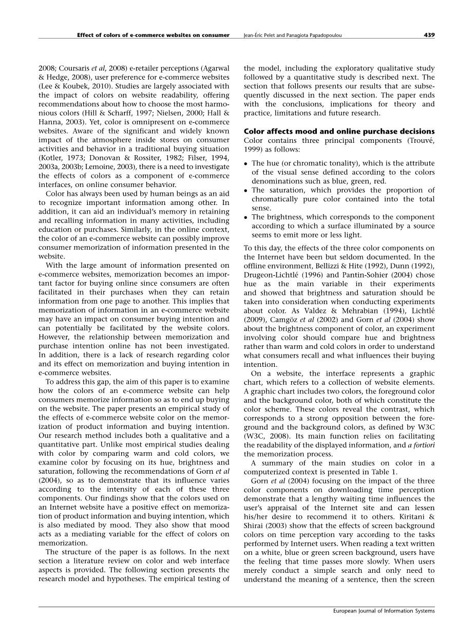 虽然颜色在各个领域都被广泛的研究(Divard&Urien,2001),直到今天,有关网络背景下的颜色研究还十分缺乏。学者们在信息系统背景下对网站背景色进行研究,尤其是人机交互、可用性和电子商务等领域,将网站背景色视为网页界面设计中的基本方面(Kang&Corbitt,2001; Coursaris等人,2008; Wu等人,2008 ; Lee&Koubek,2010)。Schmidt&Liu等学者研究发现色彩是电子商务中的重要因素,影响着网站的美观度(Schmidt&Liu,2005; Agarwal&Hedge,2008; Coursaris等,2008)、电子零售商的体验(Agarwal&Hedge,2008),以及互联网用户的网站偏好(Lee&Koubek,2010)。Hill&Scharff等学者研究发现背景色与网站可读性之间具有紧密的联系,并对如何选择最适背景色提供了相关建议(Hill&Scharff,1997; Nielsen,2000; Hall&Hanna,2003)。在电子商务网站中,色彩无处不在。考虑到传统购买环境中,商店内部氛围对消费者活动和行为的显著影响(Kotler,1973; Donovan&Rossiter,1982; Filser,1994,2003a,2003b; Lemoine,2003),我们依然需要调查颜色作为电子商务界面的组成部分之一,对网上消费者行为的影响。