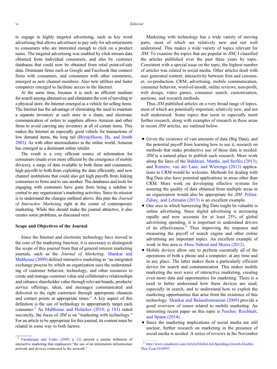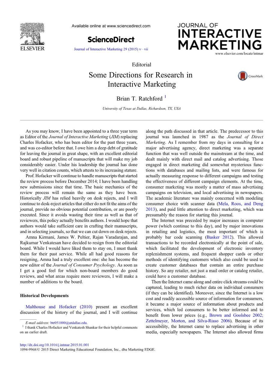 Malthouse and Hofacker (2010) present an excellent discussion of the history of the journal, and I will continue along the path discussed in that article. The predecessor to this journal was launched in 1987 as the ,Journal of Direct Marketing. As I remember from my days in consulting for a major advertising agency, direct marketing was a separate function that was well outside the mainstream at the time, and dealt mainly with direct mail and catalog advertising. Those engaged in direct marketing did somewhat mysterious functions with databases and mailing lists, and were famous for actually measuring response to different campaigns and testing the effectiveness of different campaign elements. At the time,consumer marketing was mostly a matter of mass advertising campaigns on television, and local advertising in newspapers.The academic literature was mainly concerned with modeling consumer choice with scanner data (Mela, Roos, and Deng 2013), and paid little attention to direct marketing, which was presumably the reason for starting this journal.