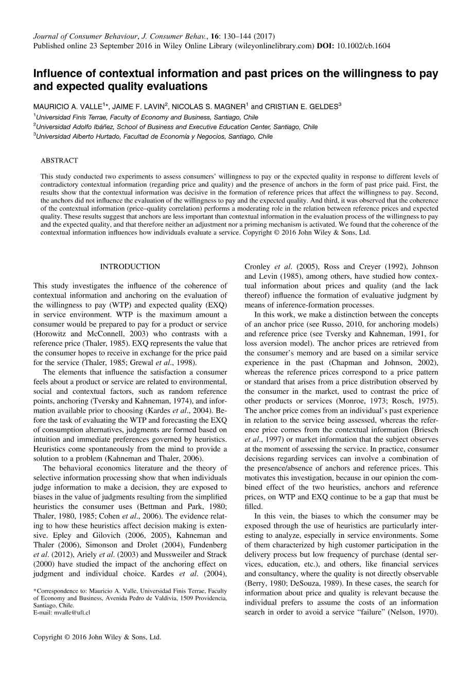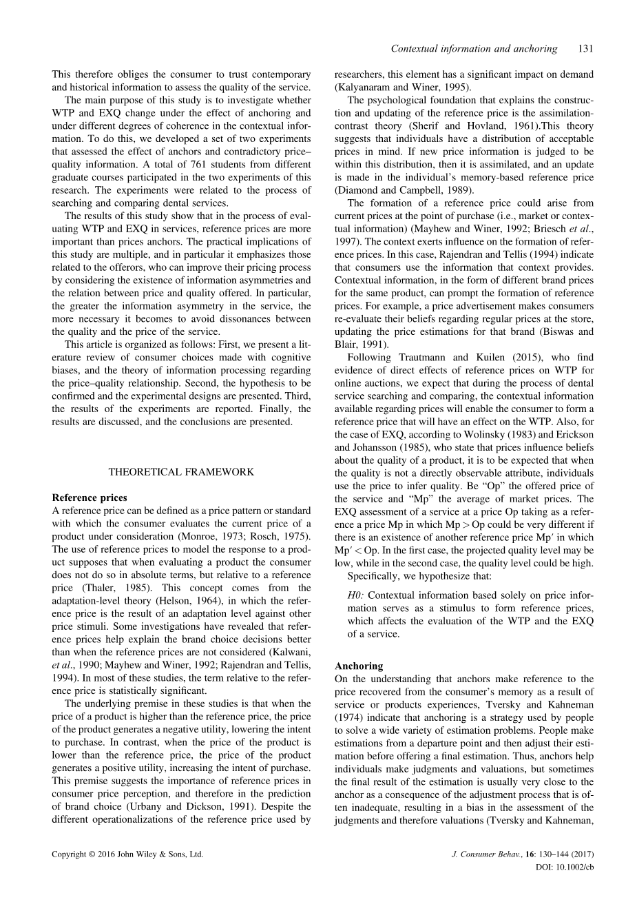 参考价格的形成可能来自购买时的当前价格(即市场或情景信息)(Mayhew和Winer,1992; Briesch等,1997)。上下文对参考价格的形成产生影响。在这种情况下,Rajendran和Tellis(1994)指出,消费者使用情境提供的信息。以相同产品的不同品牌价格为形式的情境信息可以促使参考价格的形成。例如,价格广告使消费者重新评估他们对商店正常价格的信念,更新该品牌的价格估计(Biswas和Blair,1991)。继Trautmann和Kuilen(2015)发现参考价格对WTP进行在线拍卖的直接影响的证据后,我们预计在牙科服务搜索和比较过程中,有关价格的上下文信息将使消费者能够形成参考价格将对WTP产生影响。此外,根据Wolinsky(1983)和Erickson和Johansson(1985)的观点,EXQ的情况表明,价格会影响对产品质量的信念,可以预期,当质量不是直接可观察的属性时,个人将使用价格来推断质量。将“Op”表示服务的报价和“Mp”表示市场价格的平均值。如果存在另一个参考价格Mp#39;,其中Mp#39;lt;Op,那么EXQ中评估服务的以Op作为参考价格Mp,其中Mpgt; Op,可以说是非常不同的。在第一种情况下,预计质量水平可能很低,而在第二种情况下,质量水平可能很高。
