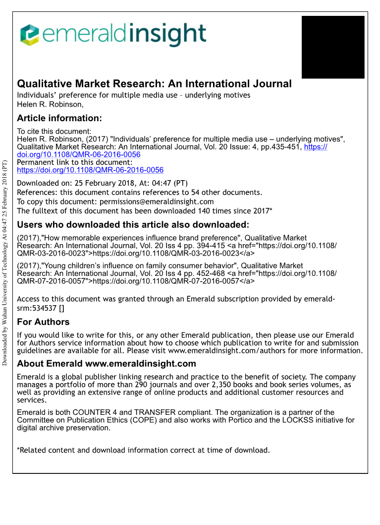 hellip;与Carrier等人 (2009年)一致,使用非概率配额抽样,面对面深入访谈和三人组(自1980年出生,Prensky,2001年),年龄在18至36岁之间。在第一阶段,研究在英国,德国和澳大利亚进行,主要是基于方便和易用性进行选择,也因为媒体消费模式存在着差异,以及明显的可用性和复杂性(路透社研究所,2012年)。总共进行了34次深入访谈,其中在英国和德国各进行了12次,在澳大利亚进行了10次,每个国家的性别比都是平衡的(Duff et al。,2014;Jeong和Fishbein,2007)。至此,有了理论饱和度的合理期望(Bryman和Bell,2011;Richie和Lewis,2003)。在阶段1数据分析之后,在第二阶段,进行了四个三合会小组来验证多义性的可信度,可转移性,可靠性和可证实性(Bryman和Bell,2011)的维度和深化对这方面研究的调查。 此外,通过使用三个国家样本和随后的三元组,三角测量是有保证的(Denzin和林肯,2011)。 由于第一阶段的调查结果没有发现任三个国家样本中每一个所确定的维度之间的差异,在英国进行了四个三人组,样本包括按年龄分组的两名女性和两名男性(18-24岁和25-36岁)。