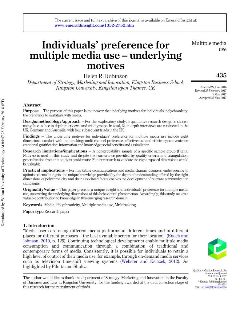 多重媒体使用的前因已经在应急的实证研究中被检验了,揭示了媒体的所有权和的可用性,以及各类受众的特征,作为媒体多任务行为的预测(Jeong和Fishbein,2007;Wang和Tchernev,2012;Kononova和Chiang,2015)。年龄被广泛认为是受众的一个关键特征 (Carrier et al., 2009;2015;Wang and Tchernev, 2012;Kononova and Chiang, 2015)。关于媒体多任务受众的进一步检验确认了“网络一代”(或“数字本地人”,Prensky,2001);生于1980年至今的人群是媒体多任务的主导人群 (Carrier et al., 2009),这并不令人惊讶,因为这个人群是在快速的技术进步的时期成长起来的。同样,Bardhi等(2010)认为,“媒体多任务是年轻消费者与商业媒体互动的方式”(Bardhi等,2010,第328页)。虽然没有得到广泛支持,但性别也被视为一个区分因素,女性占据多种媒体使用的主导地位(Jeong和Fishbein,2007;Duff等,2014)。此外,感觉寻求(Jeong和Fishbein,2007;Duff等,2014);创造力(Duff等,2014)以及个人控制;效率;信息;连接和娱乐等动机,也被揭示为媒体多任务的前因(Bardhi等,2010;Duff等,2014;Kononova和Chiang,2015;Hwang等,2014)。此外,文献表明,多媒体使用的行为现象是由个体对于执行多任务的偏好来确定的(Srivastava等,2016),被称为多时性(Bluedorn等,1999;Kouml;nig和Waller,2010)。与此一致的是,Robinson(2016)最近的一篇概念性论文也强调了多义性的相关性,与Kononova和Chiang(2015)的新兴实证工作相一致。为了提高对多媒体使用的理解,有必要确定这种行为位于多义性领域的基本动机。而现存文献揭示了多种媒体使用的组合,表明媒体消费者正在做什么。除了Bardhi等人的定性研究(2010年)不考虑媒体多任务的动机外。Bardhi等人(2010)强调了多媒体使用的自相矛盾的本质,他的研究揭示了年轻消费者对媒体多任务(效率,同化,控制,参与)以及相关成本感知的有限的益处的范围。此外,在新兴文献中发现了多种媒体使用的选择前提,包括对多义性这种行为的偏好。然而,尚未确定与多种媒体使用有关的多义性的全面范围。因此,揭示了在理解个人对多媒体使用的基本态度上的明显差距。因此,本研究的重点是多义性,即“对媒体多任务的偏好”,以更深入地理解这一概念。 这种定性研究建立在Bardhi等人(2010年)的工作基础上,更新和扩大个人对多种媒体使用态度的探索范围。 具体来说,这项研究探讨了个人偏好多媒体多媒体处理的基本动机,以充分确立多义性的维度。