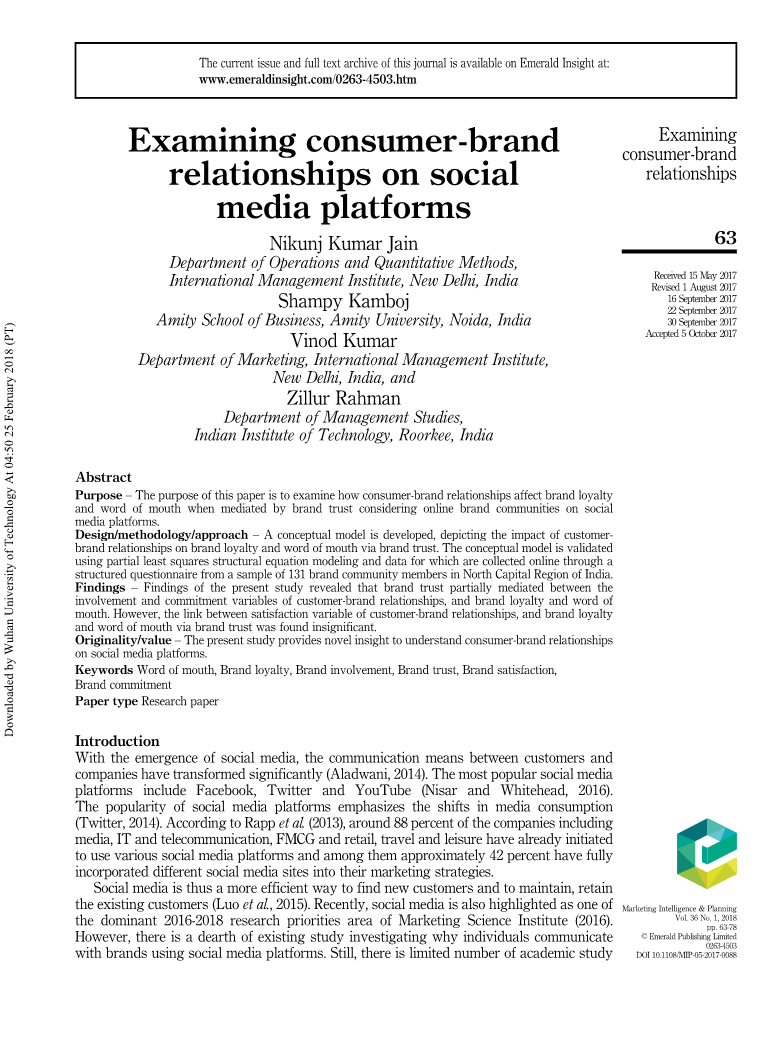 研究目的 - 本文的目的是考察消费者 - 品牌关系如何影响品牌忠诚度和口碑传播,并通过社交媒体平台考虑在线品牌社区的品牌信任。