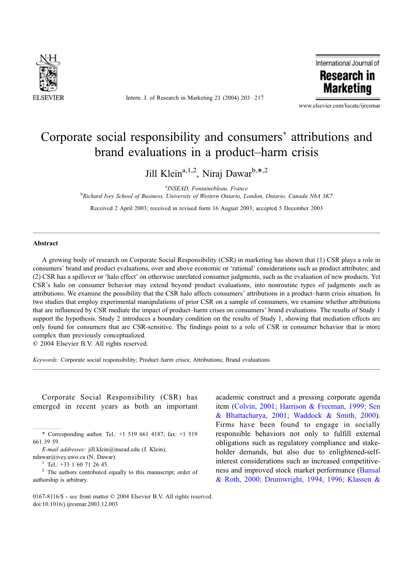 光环效应是一种因为一个措施溢出到另一个措施而产生的“偏见”,(Thorndike,1920)。例如,对于保时捷性能特征的强烈消费者信念可能会渗透到其可靠性信念上;或消费者对品牌的整体态度可能会溢出对他们对该品牌特定属性的评估(Beckwith&Lehmann,1975)。在这项研究中,我们特别关注消费者以前关于公司在企业社会责任方面的看法的光环效应,以及涉及该公司的产品危害危机的归因。当受影响的措施与光环的来源无关时,光环效应最显着,因为当受影响的措施相关时,不可能将光环效应与名誉效应分开。以前在营销方面的研究表明了企业社会责任如何影响不相关的产品评估。在这项研究中,我们研究了企业社会责任信念如何溢出对产品危害危机的归因。