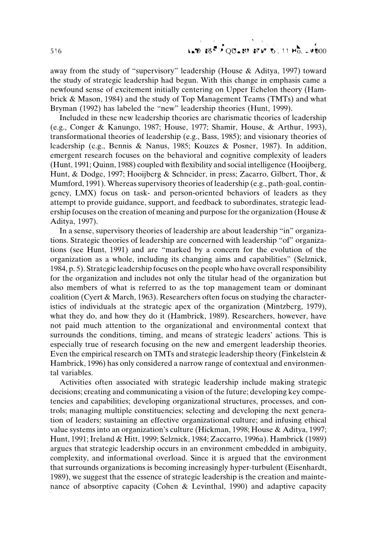 在过去十年中,有趣的新的领导力研究已经发表,而有关战略领导的文献,却相对较少我们相信这些新兴的理论在引起注意。我们进一步了解我们所说的三大基石战略领导能力:学习能力、变革能力和管理智慧。在这里,我们强调竞争的价值观框架的想法(Quinn,1988)、行为的复杂性(例如Hooijberg和Quinn,1992),认知能力(例如,Jaques,1989),和社会情报(例如,Zaccaro et al.,1991)。Hall(1992)认为,领导的有效性可能更多地取决于社会文化性和行为的灵活性比其他因素。下面,我们简要地回顾一下在这四个方面的研究,然后突出他们如何进一步战略领导力理论与研究。
