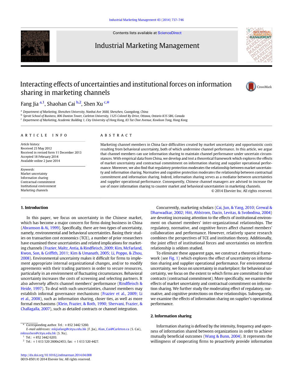 和信息共享。规范和认知保护解决了契约之间的关系承诺和信息共享。事实上,信息共享是不确定性之间的调停者和供应商运营绩效。因此,建议中国渠道经理增加利用更多的信息共享来对抗市场营销渠道的行为不确定性。