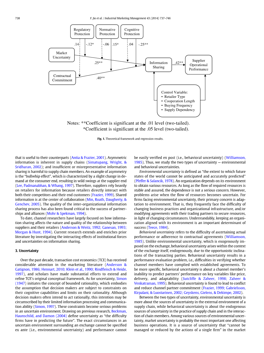 在本文中,我们关注中国市场的不确定性,这已经成为在中国经商的公司的主要关注点(Abramson&Ai,1999)。具体来说,有两种不确定性,即环境和行为不确定性。根据他们的学业交易成本经济学(TCE),一些以前的研究人员已经研究了这些不确定性和相关的影响渠道(Frazier,Maltz,Antia,&Rindfleisch,2009; Kim,McFarland,Kwon,Son,&Griffith,2011; Kim&Umanath,2005;李波波,周,2008)。环境不确定性使企业难以实施适当的内部组织变更和/或修改与贸易伙伴达成协议,以确保资源安全,特别是在环境波动的环境中。行为的不确定性增加了筛选和选择合作伙伴的成本。它也对通道成员的表现产生不利影响(Rindfleisch&Heide,1997)。为了应对这些不确定性,渠道成员可能会建立非正式治理机制(Frazier et al。,2009; Li等等,2008),例如信息共享,更密切的关系以及更多的关系正式机制(Klein,Frazier,&Roth,1990; Shervani,Frazier,Challagalla,2007),例如详细的合同或渠道整合。同时,营销学者(蔡俊军,2010年; Grewal&Dharwadkar,2002; Hitt,Ahlstrom,Dacin,Levitas,&Svobodina,2004)越来越重视制度环境的影响渠道成员之间的组织间关系。该监管,规范和认知力量影响通道成员协作和表现。但是研究比较稀少结合传统文化表现形式和制度理论的观点。另外,制度力量和不确定性在联系中的共同作用关系很少研究。为了消除这些明显的差距,我们构建了一个理论框架(见图1),探讨不确定性对信息的影响共享和供应商运营绩效。为环保不确定性,我们专注于市场的不确定性;对于行为不确定性,我们专注于企业致力于他们的程度合同(合同承诺)。更具体地说,我们检查市场不确定性和合同承诺对信息的影响我们进一步研究监管,规范,以及对这些关系的认知保护。后来,我们检查信息共享对供应商运营的影响性能。