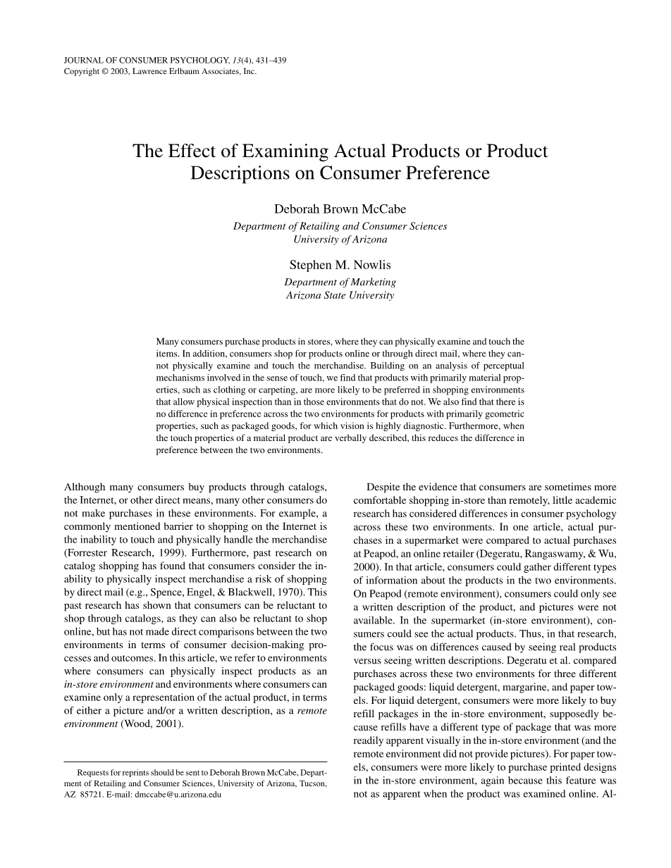 在这篇文章中,我们不仅考察包装类商品的选择,也有其他类型的商品的选择。特别是,我们专注于其他通常购买的项目,如服装,家居用品和电子产品,所有的这些通常不是可能在杂货店购买。 当消费者在商店里评价这些类型的产品时,不像包装的商品,他们可能会想触摸他们或尝试他们。.因此,商场购物的一个重要因素就是接触产品的能力。在一个远程的环境里,消费者由于无法触摸商品而必须依靠视觉。因此,本文重点研究了两种不同类型的信息—通过触摸信息收集(在商店内) 和通过视觉收集的信息(远程)—来判断消费者决策与偏好。