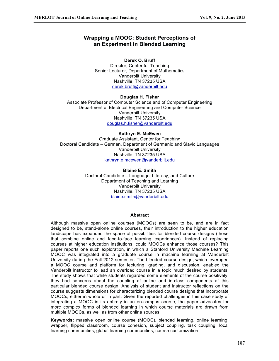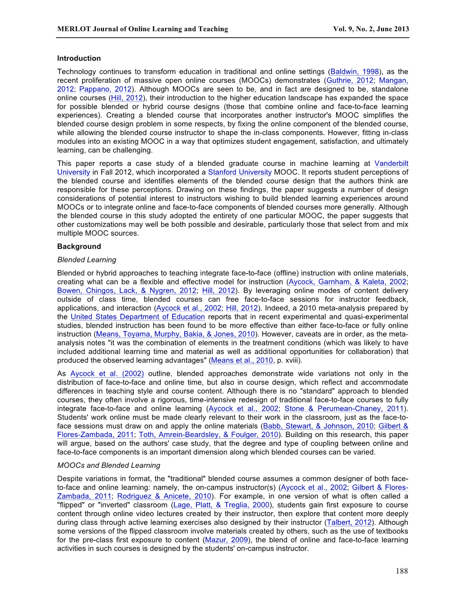 技术继续改变传统教学和在线教育的教育方式(鲍德温,1998年),正如最近大规模开放在线课程(MOOCs)的激增(MOOCs)展示(Guthrie,2012;Mangan,2012;Pappano,2012)。虽然moocs被认为是,而且实际上是被设计成独立在线课程(Hill,2012年),他们对高等教育领域的介绍已经扩展了可能的混合或混合课程设计的空间(那些结合线上和线下的经验)。创建一个混合课程,合并另一个导师的MOOC,在某些方面简化了混合课程设计问题,通过修复混合课程的在线组件,同时允许混合课程指导教师塑造课堂上的组成部分。然而,以一种优化学生参与、满意度和最终学习的方式,将课堂模块融入到现有的MOOC中,可能具有挑战性。