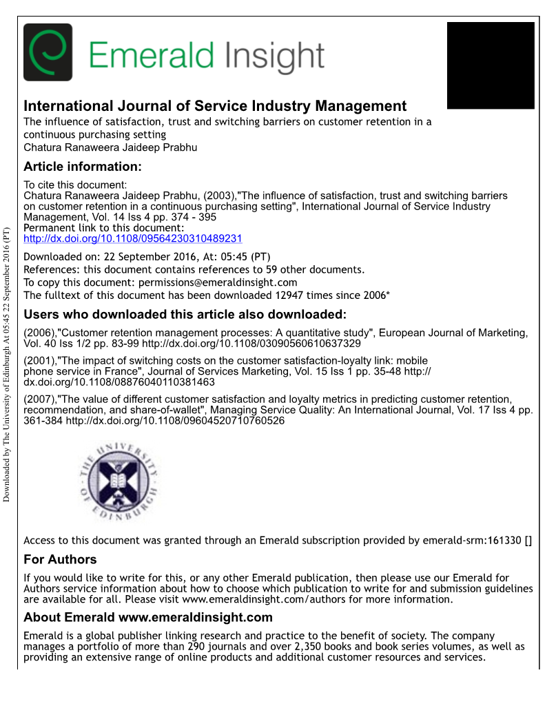 最近的研究表明,在某些情况下,服务提供商可能无法保留即使那些满意的客户(例如Heskett等人,1994; Schneider和Bowen,1999)。因此,单靠满意度可能不足以确保长期客户对单一供应商的承诺。相反,可能有必要超越对满足其他增强保留(例如信任)的变量的满足(Hart和Johnson,1999)。这种观点与营销渠道的研究一致(例如,摩根和亨特,1994年),这表明,为了确保经济上可行的长期关系,企业往往不满足于开发信任。此外,这一建议是基于一旦信任被建立在关系中,任何一方结束关系的可能性由于高终止成本而降低。