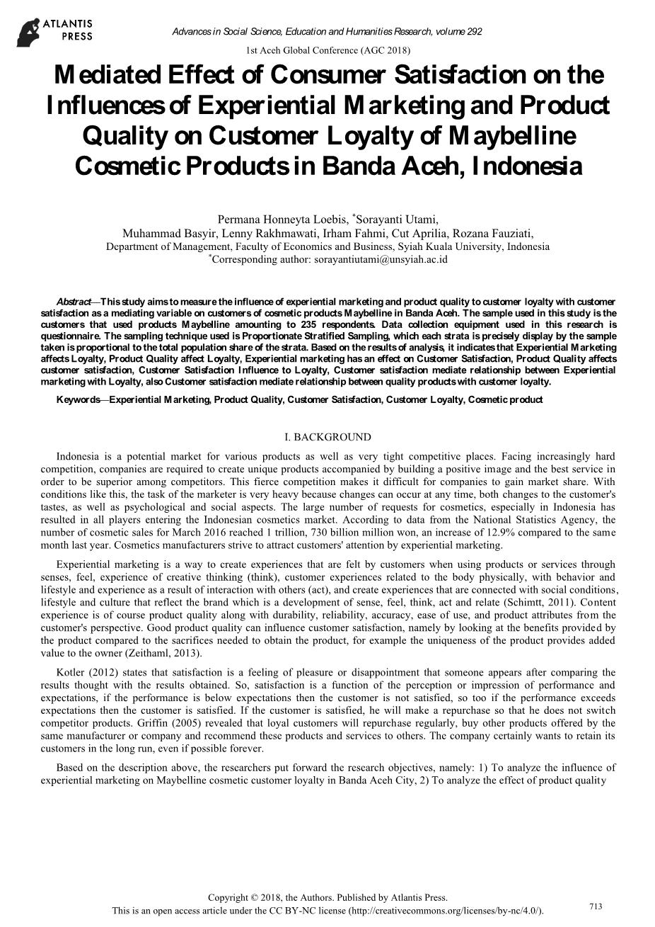 研究地点在班达亚齐市。本研究的目标是体验营销,产品质量,客户满意度和客户忠诚度。