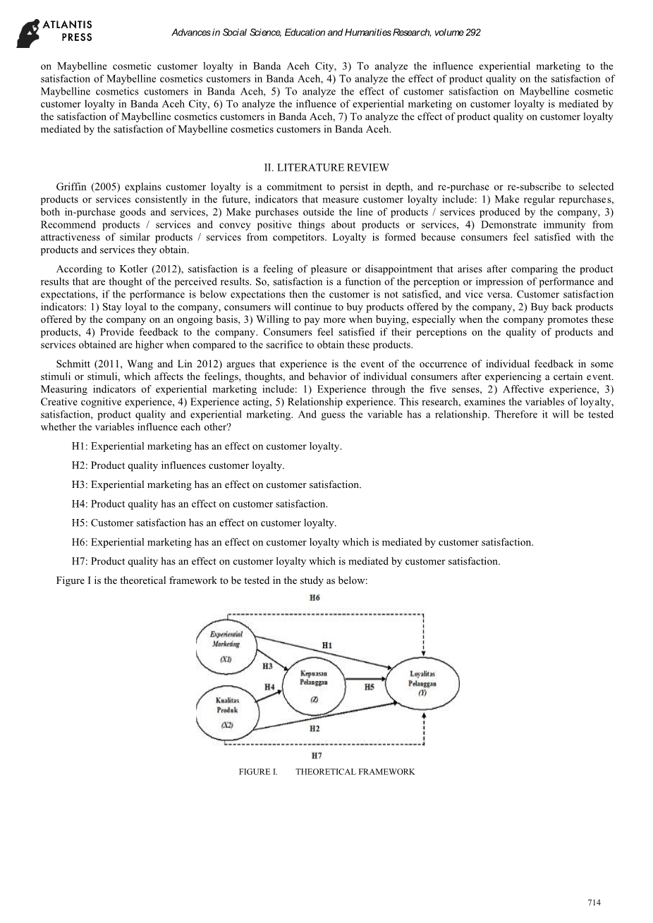 基于上述描述,研究人员提出了以下研究目标:1)分析体验式营销对班达亚齐市美宝莲化妆品客户忠诚度的影响,2)分析产品质量的影响关于班达亚齐市美宝莲化妆品客户忠诚度的问题,3)分析体验营销对班达亚齐美宝莲化妆品客户满意度的影响,4)分析产品质量对班达亚齐美宝莲化妆品客户满意度的影响,5 )分析客户满意度对班达亚齐市美宝莲化妆品客户忠诚度的影响,6)分析体验营销对客户忠诚度的影响是由班达亚齐市美宝莲化妆品客户的满意度所介导的,7)分析班达亚 齐的美宝莲化妆品客户的满意度介导了产品质量对客户忠诚度的影响。