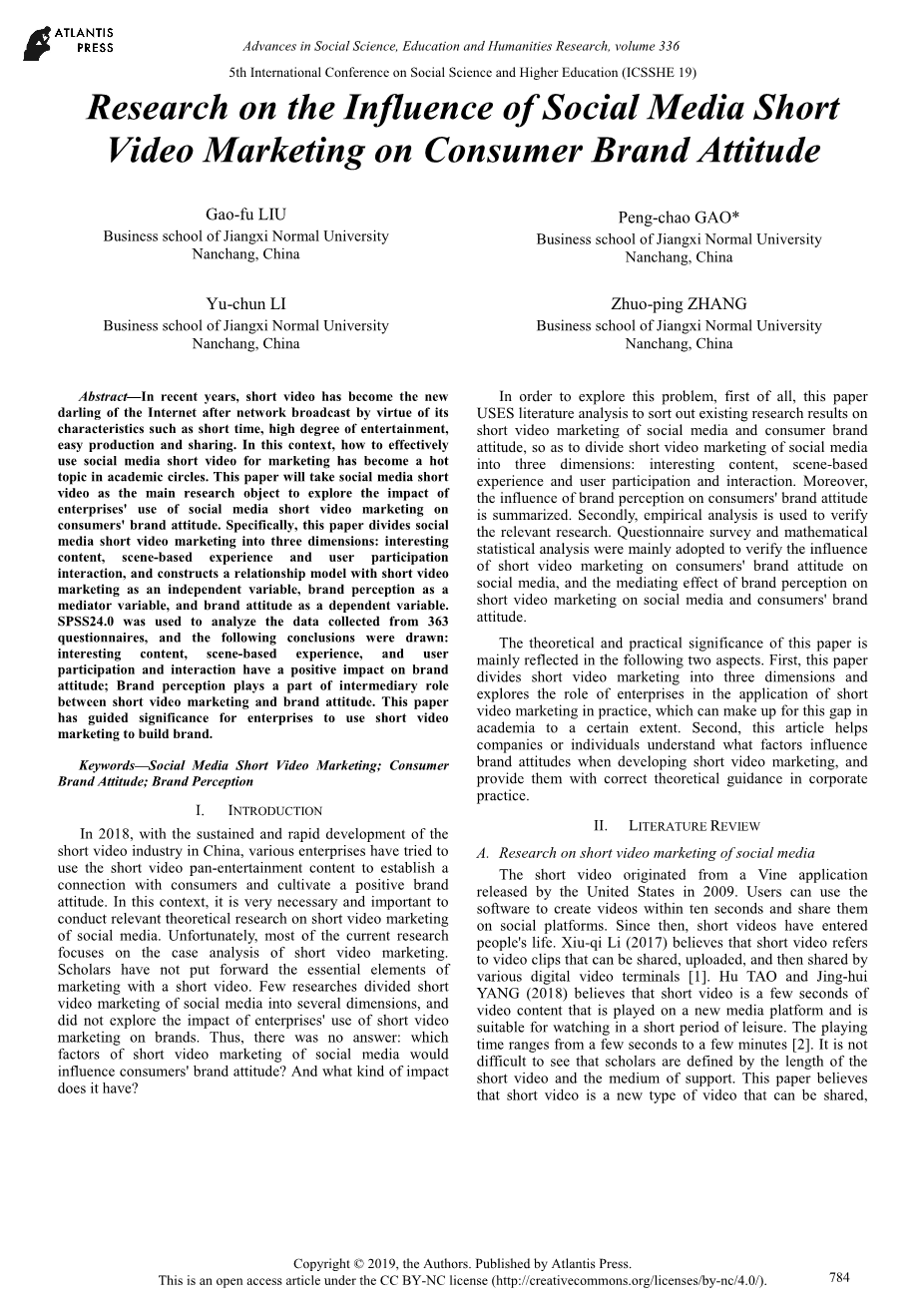 2018年,随着中国短视频产业的持续快速发展,多家企业尝试利用短视频的泛娱乐内容与消费者建立联系,树立积极的品牌态度。在这种情况下,对社交媒体短视频营销进行相关的理论研究是非常必要和重要的。不幸的是,当前的大多数研究都集中在短视频营销的案例分析上。学者们并没有通过简短的视频提出营销的基本要素。很少有研究将社交媒体的短视频营销划分为多个维度,并且没有探讨企业使用短视频营销对品牌的影响。因此,没有答案:社交媒体短视频营销的哪些因素会影响消费者的品牌态度?它将产生什么样的影响?