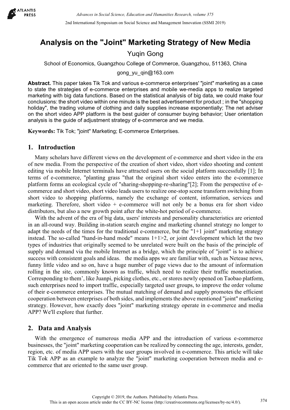 随着众多媒体应用的出现和各种电子商务业务的推出,将媒体应用用户的年龄、兴趣、性别、地域等与参与电子商务的用户群体联系起来,实现“联合”营销合作。本文将以TikTok应用为例,分析面向同一用户群的媒体与电子商务“联合”营销合作。