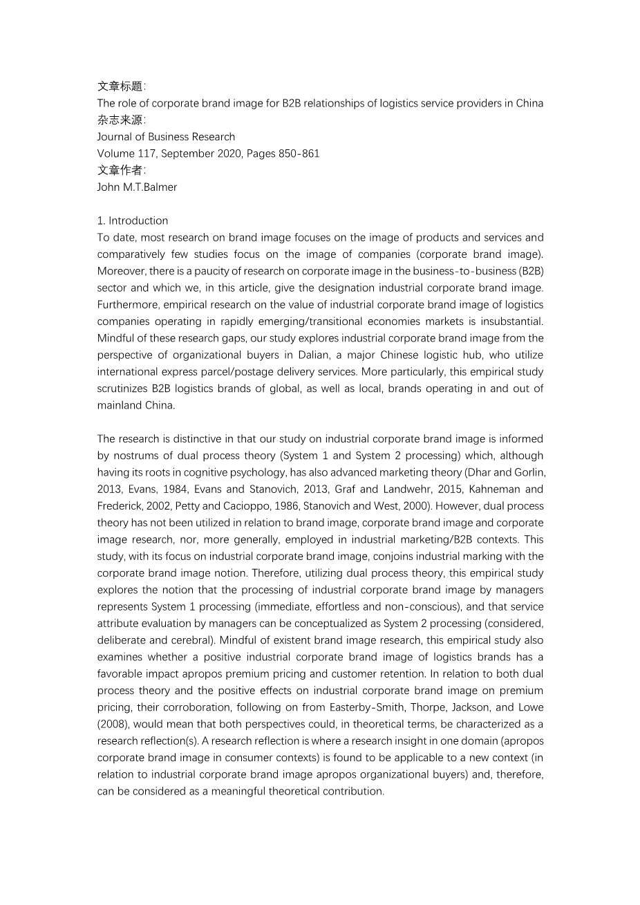 文章接着讨论了亚洲和中国的国际物流品牌,并通过对双重过程理论、企业品牌、企业形象、品牌形象、企业品牌形象和工业企业品牌形象的讨论,探讨了本研究的概念背景。接下来是假设的发展和所用方法的讨论。文章最后对研究结果进行了反思,并讨论了本研究的局限性以及未来研究的方向。