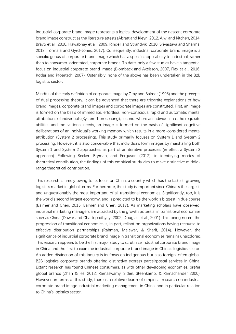这项研究是及时的,因为它把重点放在中国:一个在全球范围内拥有增长最快的物流市场的国家。此外,这项研究是重要的,因为中国是最大的,毫无疑问是最重要的,所有转型经济体。同样重要的是,它是世界第二大经济体,并预计在适当的时候成为世界上最大的经济体(Balmer和Chen,2015年,Balmer和Chen,2017年)。正如营销学者所观察到的,工业营销经理被中国等转型经济体的增长潜力所吸引(Dawar和Chattopadhyay,2002年,Douglas等人,2001年)。值得注意的是,转型期经济体的发展在一定程度上依赖于能够求助于有效分销伙伴关系的组织(Rahman、Melewar和Sharif,2014)。然而,工业企业品牌形象在转型经济体中的意义还未被探索。这项研究似乎是第一个主要研究审查工业企业品牌形象在中国和第一个审查工业企业品牌形象在中国的物流部门。这项调查的另一个区别是,它关注的是在中国提供独特的快递包裹/邮政服务的本土但也是外国的B2B物流企业品牌,通常是全球性的。现有研究发现,与其他发展中经济体一样,中国消费者更喜欢全球品牌(Zhanamp;He,2012;Ramaswamy,Slden,Steenkamp,amp;Ramachander 2000)。然而,就本文的研究而言,对我国工业企业品牌形象的实证研究相对较少,尤其是对我国物流行业的实证研究。
