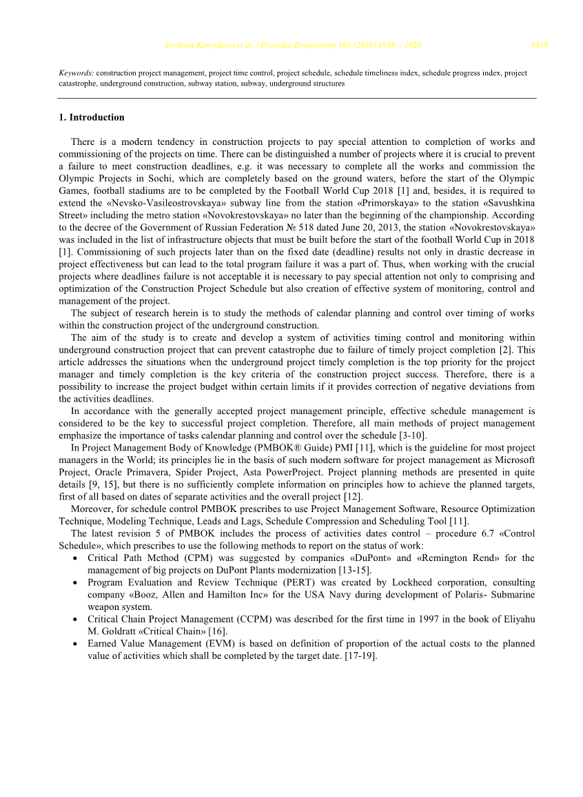 挣值管理(EVM)是基于对计划值的活动,将由目标完成日期实际成本比例的定义。[补充]。1920 Svetlana Kanyukova et al. / Procedia Engineering 165 (2016) 1918 – 1924