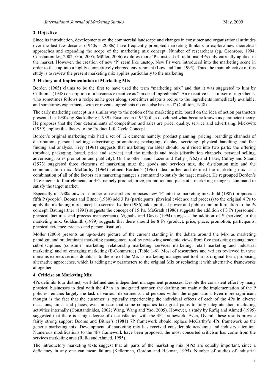 本研究的主要目的,是回顾当前的营销组合是否适合尤其是现在的市场。这项研究给营销人员提供了一个想法那就是营销组合可以作为一个工具来帮助他们追求他们的营销目标。波登(1965)声称他是第一个使用这个营销组合术语的人,最开始是游卡利敦于1948年建议他使用的的。麦卡锡于1964年提出了营销组合这个概念,通常被称为4 PS。1997年,班纳特将营销策划概念付诸成为实践的一种手段,营销组合的概念最开始是来自于Chong(崇)在2003所提出的单一P(价格)的微观经济学理论。1995年,Low and Tan,引入了新的PS理念来适应充满竞争的市场环境,2006年,穆勒从五个营销管理子学科(消费者营销,关系营销,服务营销,零售营销和我 工业营销)和新兴市场(电子商务)的方面回顾学术观点,在当前状况下提出了一种最新的设想,那就是把营销组合作为营销模式和营销管理工具。4 PS的概念被大量的研究讨论,例如,Lauterborn(1990),Moller(2006),Popovic(2006)和Fakeideas(2008)。然而,尽管存在不足,4Ps仍然是营销组合的主要内容,而后来,PS仍然没有克服对实际应用程序的可性和一致性(肯特和布朗,2006年)。