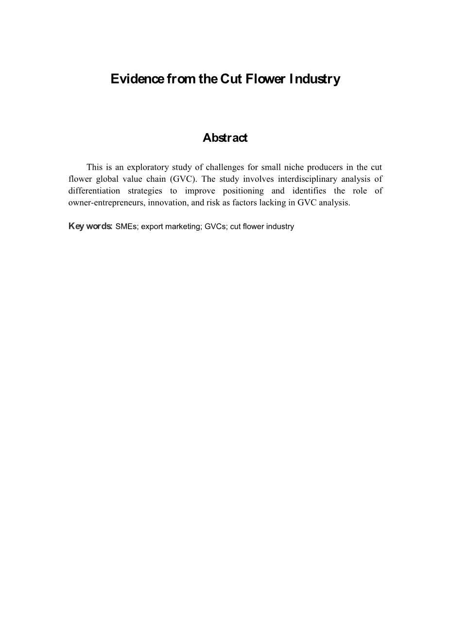 该文件进行如下,我们首先从与中小企业有关的出口营销文献中列出了特定的概念。 然后,我们从GVC文献中提出了关键维度,我们的目标是以跨学科的方式用于描述全球行业背景,然后我们将对此进行描述。 然后,我们提出了我们的研究方法,并提供了四个新西兰案例研究公司在切花GVC中的地位的探索性分析。 其次是在最后一节中激发管理意义和未来研究方向的讨论。