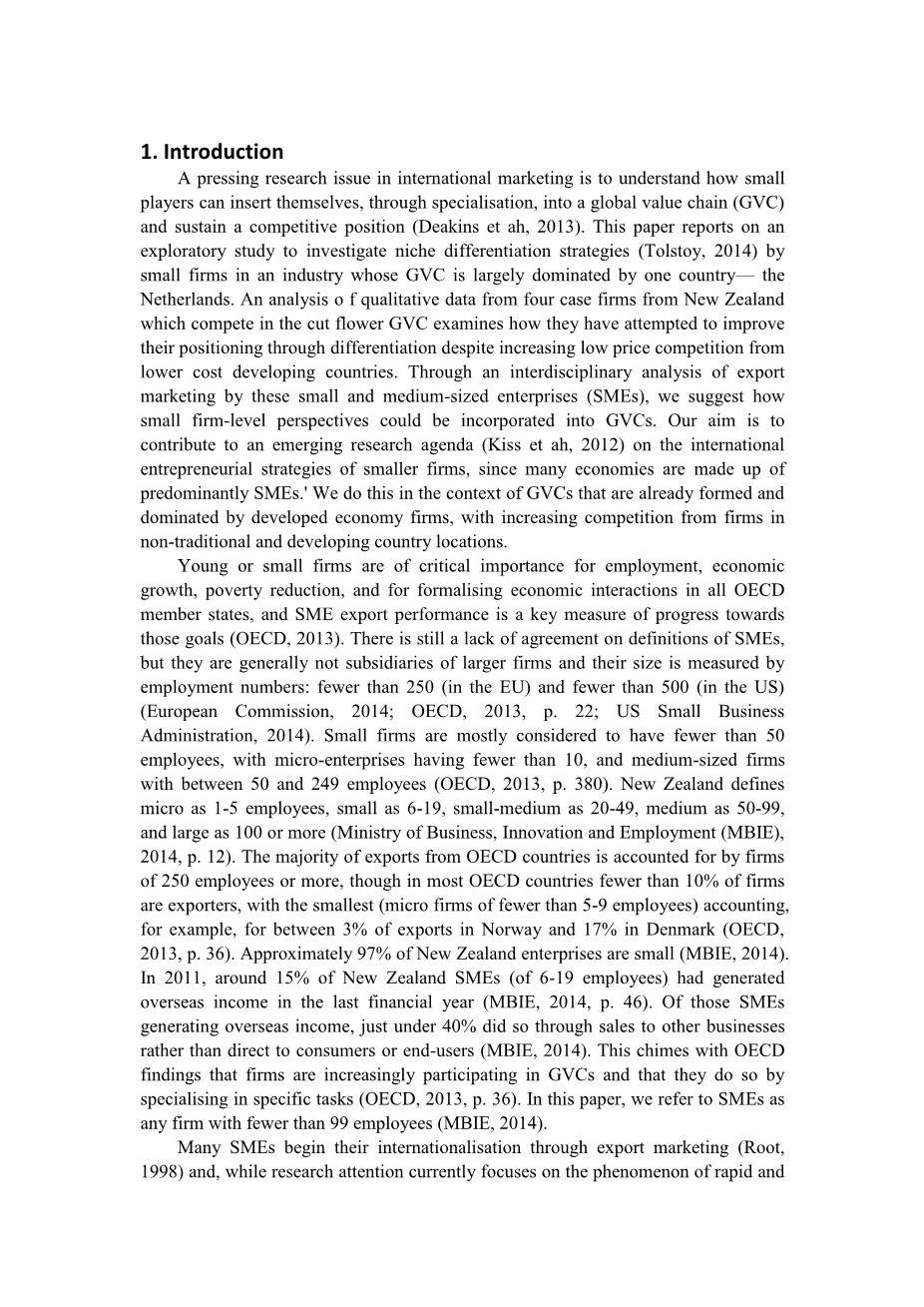 许多中小企业通过出口营销开始国际化(Root,1998),而研究关注的焦点目前集中在国际新兴企业快速和早期国际化的现象(Zahra,2005)或全球化(Chetty和Campbell-Hunt,2004; Oviatt和麦克杜格尔(McDougall,1994)),许多小公司仍然会经历渐进的,渐进的,国际化的扩张(Johanson和Vahlne,1977)。尽管他们的国际化可能很慢,但它仍然需要创新和利基差异化(Chetty和Campbell-Hunt,2004)。我们的研究是由于这样的观察,即尽管许多国家的大部分中小企业都没有国际化,但是一小部分新西兰公司似乎有动力参与以荷兰为主的竞争激烈的全球价目比赛。我们对出口的任何中小企业感兴趣(DAngelo et al。,2013),以及它们如何将自身纳入全球产业的结构,而不是逐步实现国际化,从出口到逐步向国际业务提供更多资源(Johanson和Vahlne,1977),也没有试图从成立以来迅速国际化(Knight和Cavusgil,2004; Oviatt和McDougall,1994; Zahra,2005)。我们同意Tolstoy(2014)和Zahra(2005)的观点,即需要了解企业在国外市场建立后如何竞争“(Tolstoy,2014,第19页)。