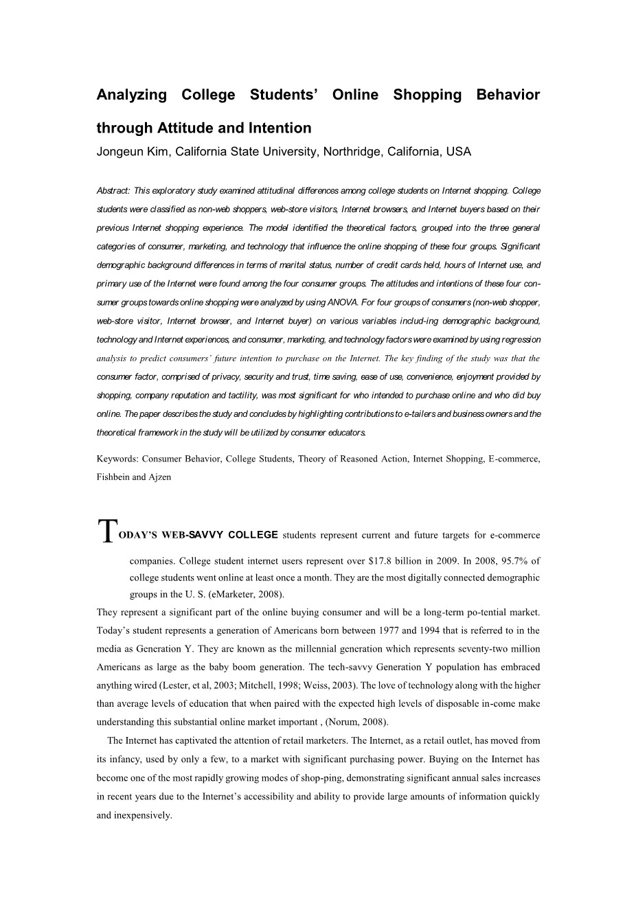 本次研究的目的是探索四组网络消费者网上购物时的态度的不同:当前的非网购消费者,不带有任何购买意图来访问网上商店的用户,有意图在网上购物但最终却没有的用户,以及有心在网上购物而且已经在网上预测了这些组中的每一个购物行为。这项研究的关注点在了解这四组人关于态度决定网上购物,意图和购物体验的不同。Fishbein and Ajzenrsquo;s(1975)的理性行为理论被用于网上购物消费者的分析。