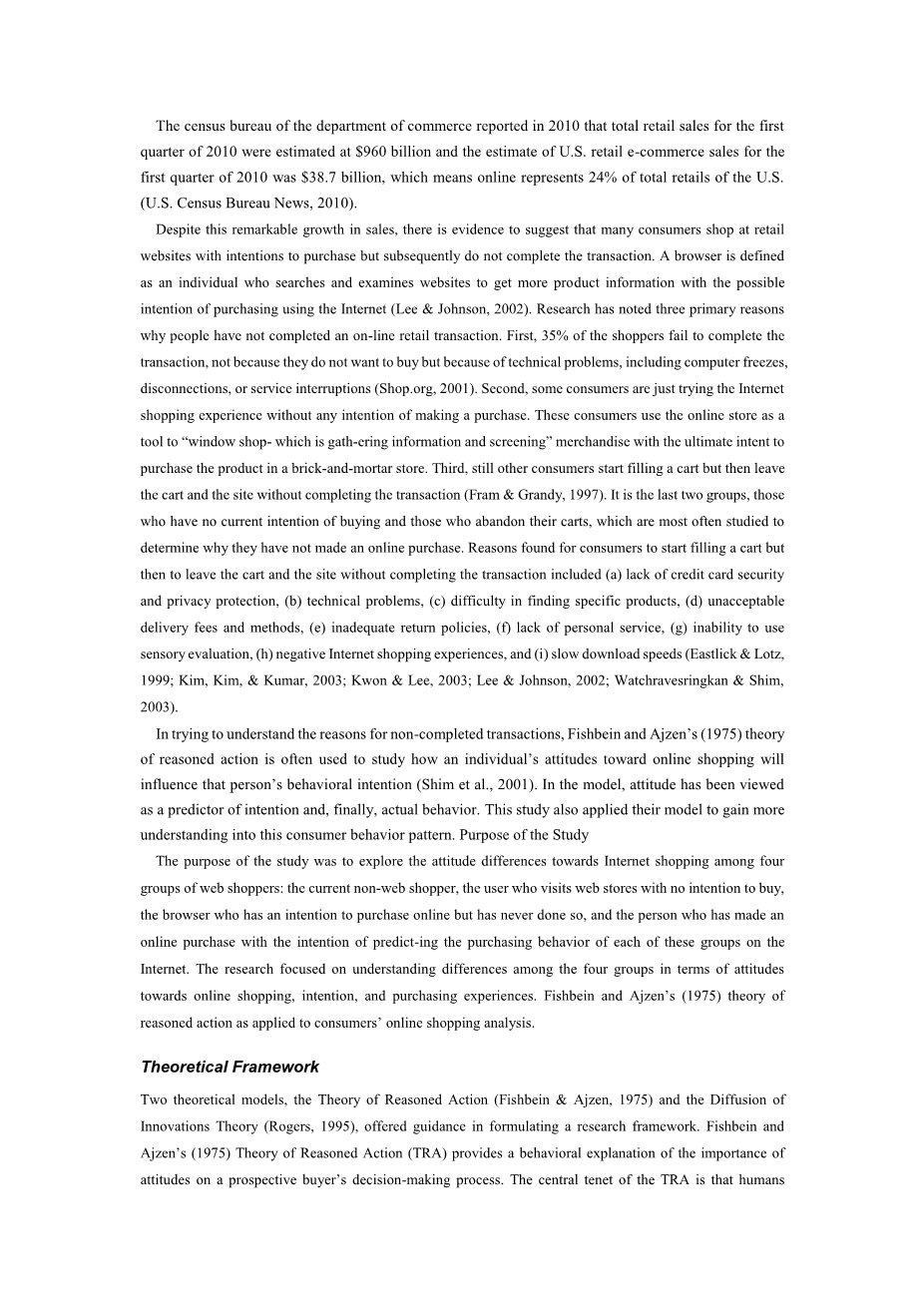 在试图了解没有完成交易的原因上,Fishbein and Ajzenrsquo;s(1975)理性行为理论经常被用来去研究个人对于网络购物的态度是如何影响一个人的行为意图的(Shim et al.,2001)。在模型中,态度被认为是意图的预测,并且最终导致实际行为。这个研究模型也被应用来获取更多的消费者行为模式上。