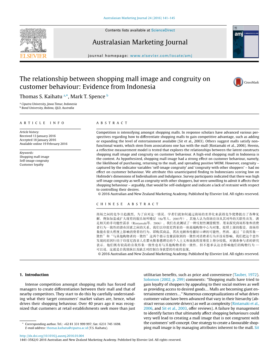 商场形象和一致性之间的关系对顾客行为:来自印度尼西亚的证据 外文翻译资料