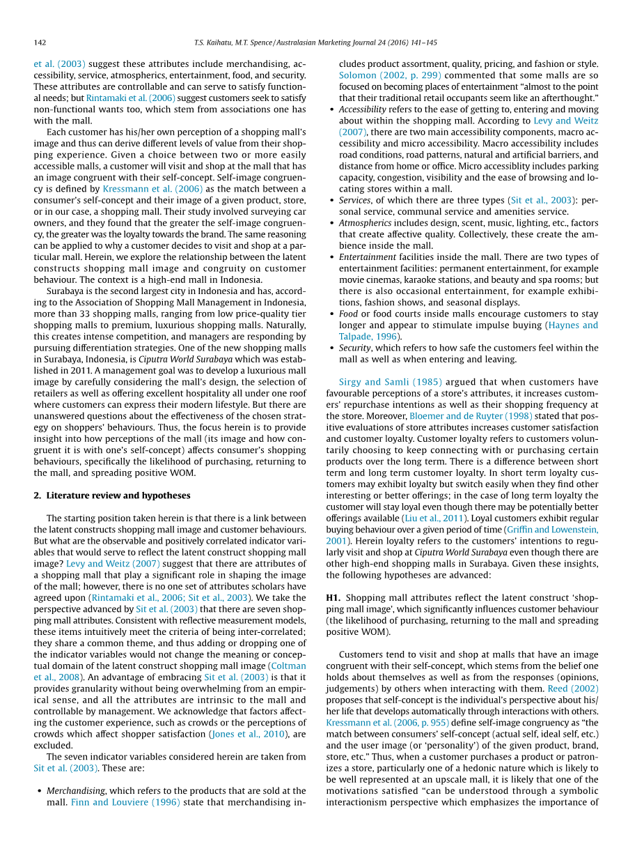 每个客户都有自己的购物中心的形象,从而可以得出不同的价值水平,从他们的店铺平的经验。在两个或两个比较容易到达的购物中心之间选择,顾客会在购物中心购物,并与自己的形象一致。自我形象的克雷斯曼定义。(2006)作为消费者的自我概念和他们的形象的一个给定的产品,商店,或在我们的例子中,一个购物中心。他们的研究涉及调查的车主,他们发现自己更大,更是对品牌的忠诚度。同样的道理可以应用到为什么顾客决定访问和在特定商场。在这里,我们探索之间的潜在关系构建购物中心形象一致性对顾客行为。背景是印度尼西亚的高端购物中心。