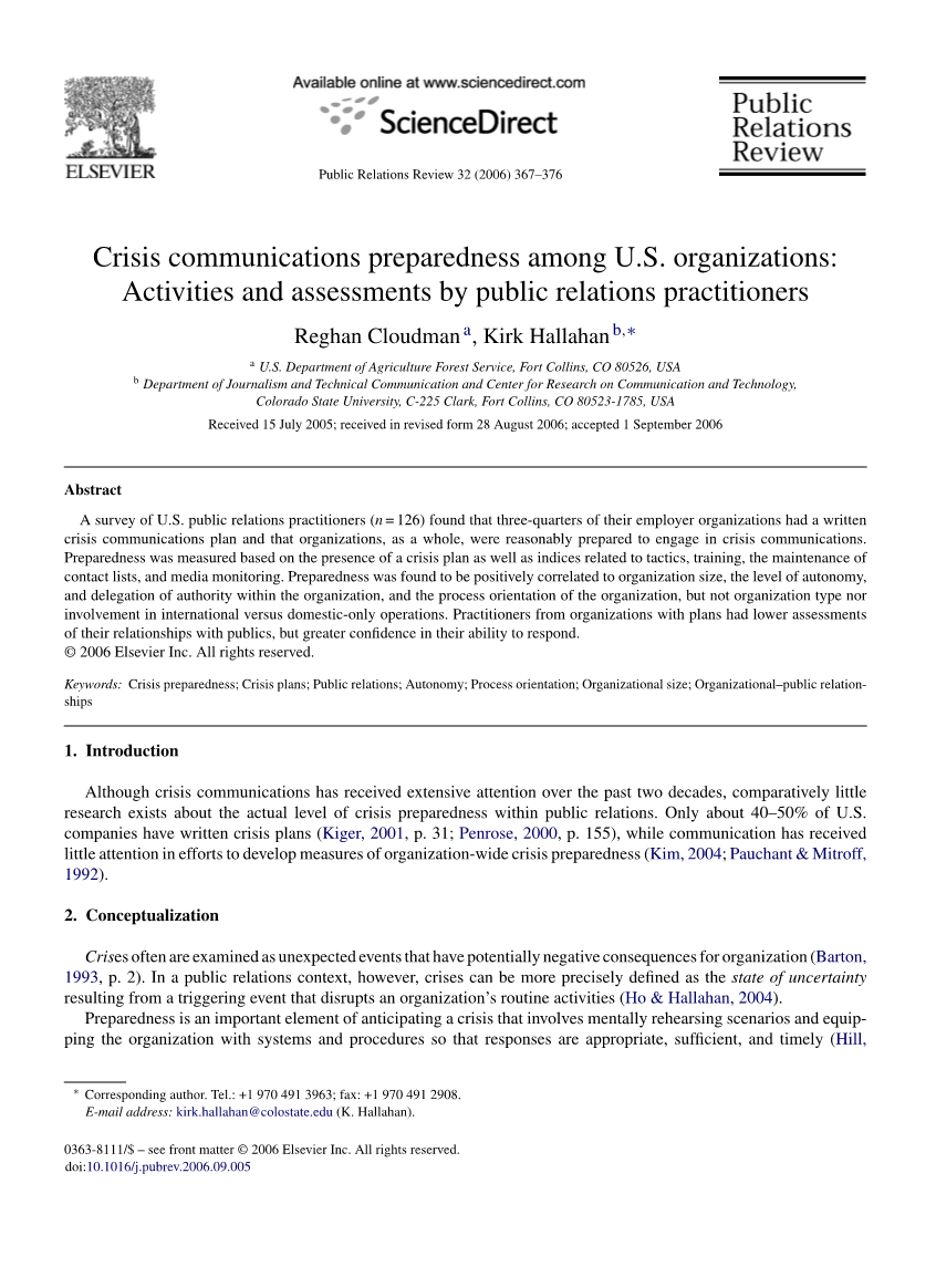 美国组织的危机沟通准备:公共关系从业者的活动和评估