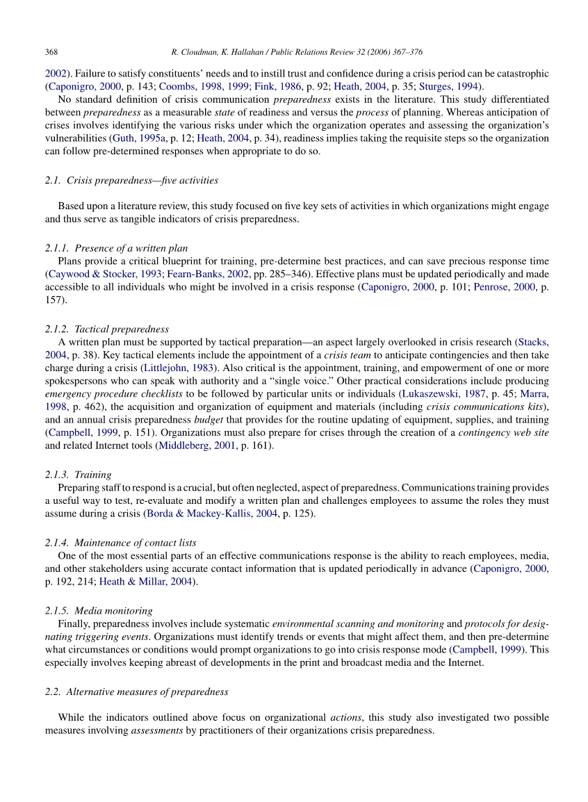 美国公共关系从业者(N = 126)的一项调查发现,四分之三的雇主组织有一个书面的危机沟通计划和组织,作为一个整体,有合理的准备从事危机沟通。准备措施的基础上存在的危机计划,以及相关的战术,培训,联系人列表的维护和媒体监测指标。准备被认为是呈正相关的组织规模,自治的水平,并在组织内的权力下放,组织的过程取向,但不是组织类型,也没有参与国际与国内唯一的业务。从业人员从组织与计划有较低的评价与公众的关系,但更大的信心,他们的反应能力。