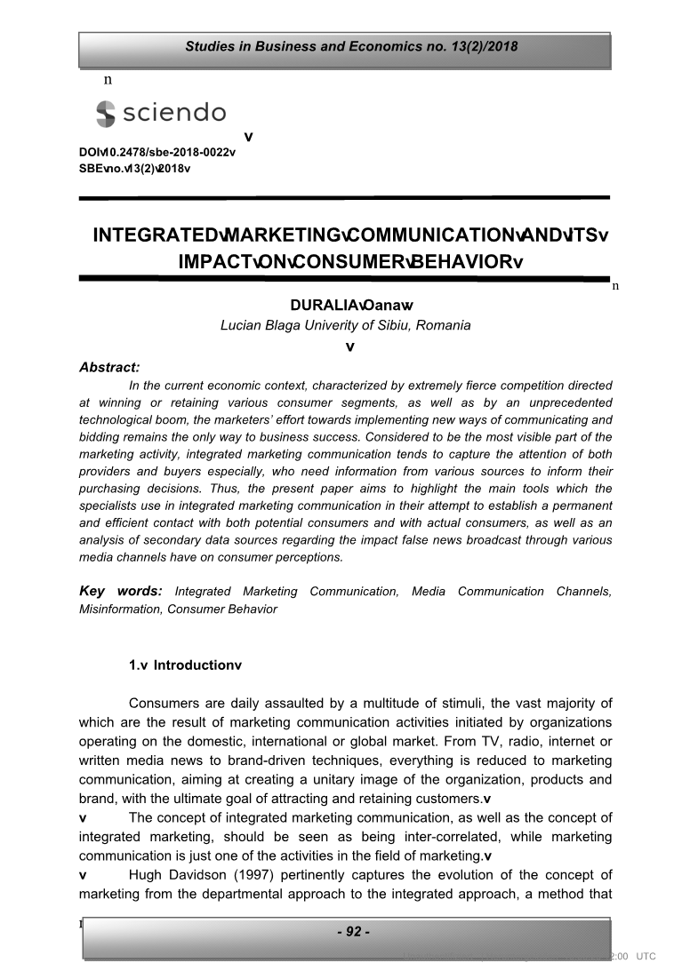 在当前的经济背景下,市场竞争激烈,它旨在赢得或保留各种消费者群体,再加上前所未有的技术繁荣,营销人员努力采用新的沟通和出价方式仍然是企业成功的唯一途径。被认为是营销活动中最明显的部分,整合营销传播往往会吸引提供者和购买者的注意力,尤其是需要各种来源的信息来指导其购买决策的购买者和购买者。因此,本文旨在突出专家在整合营销传播中使用的主要工具,以试图与潜在消费者和实际消费者建立永久有效的联系,并分析有关影响的辅助数据通过各种媒体渠道传播的虚假新闻是如何影响消费者的看法。
