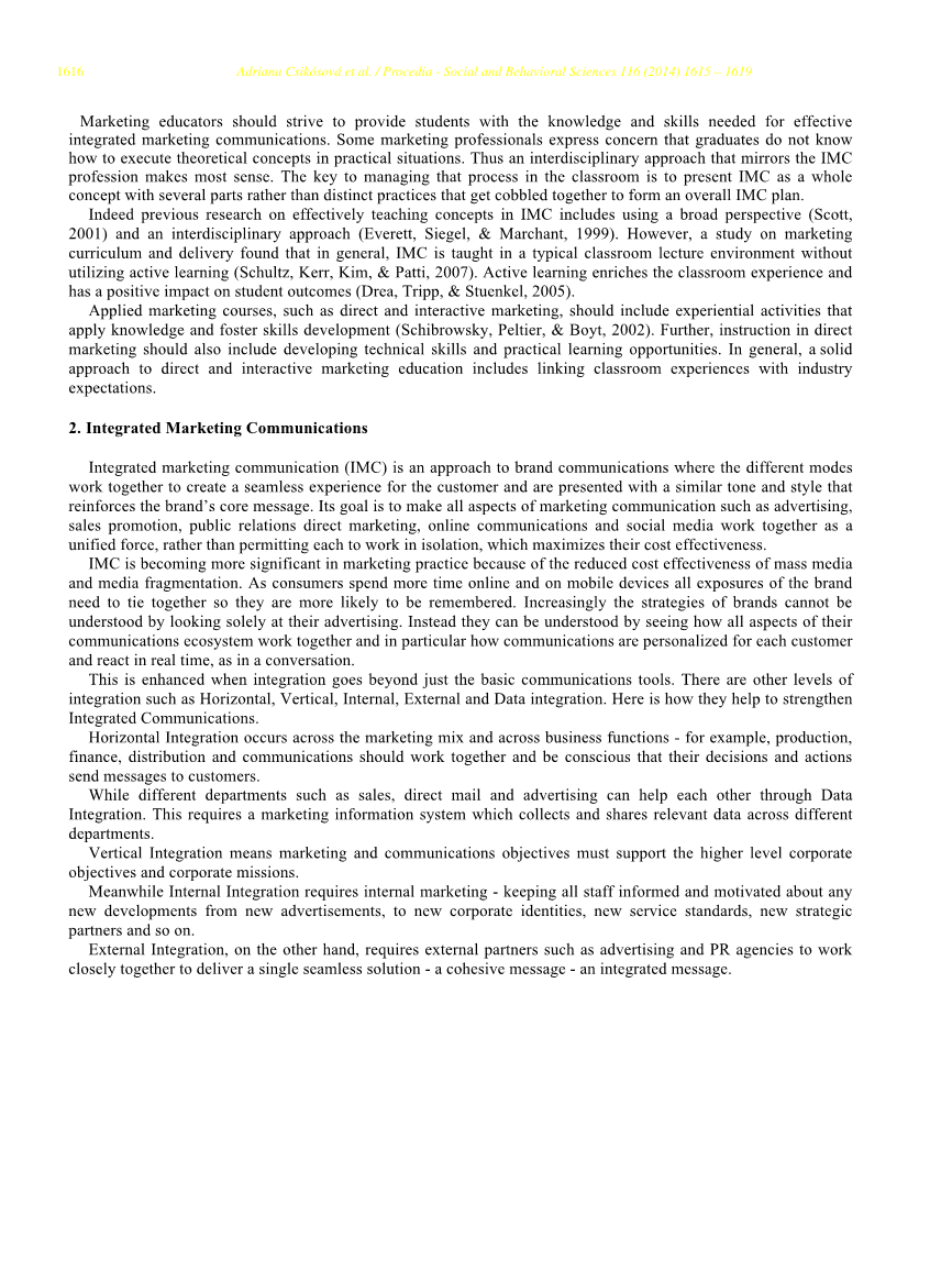 事实上,先前关于IMC中有效教学概念的研究包括使用一个广阔的视角(Scott, 2001)和一个跨学科的方法(Everett, Siegel, amp; Marchant, 1999)。然而,一项关于市场营销课程和交付的研究发现,IMC通常是在典型的课堂授课环境中进行教学,没有使用主动学习(Schultz, Kerr, Kim, amp; Patti, 2007)。主动学习丰富了课堂经验,对学生的成绩有积极的影响(Drea, Tripp, amp; Stuenkel, 2005)。