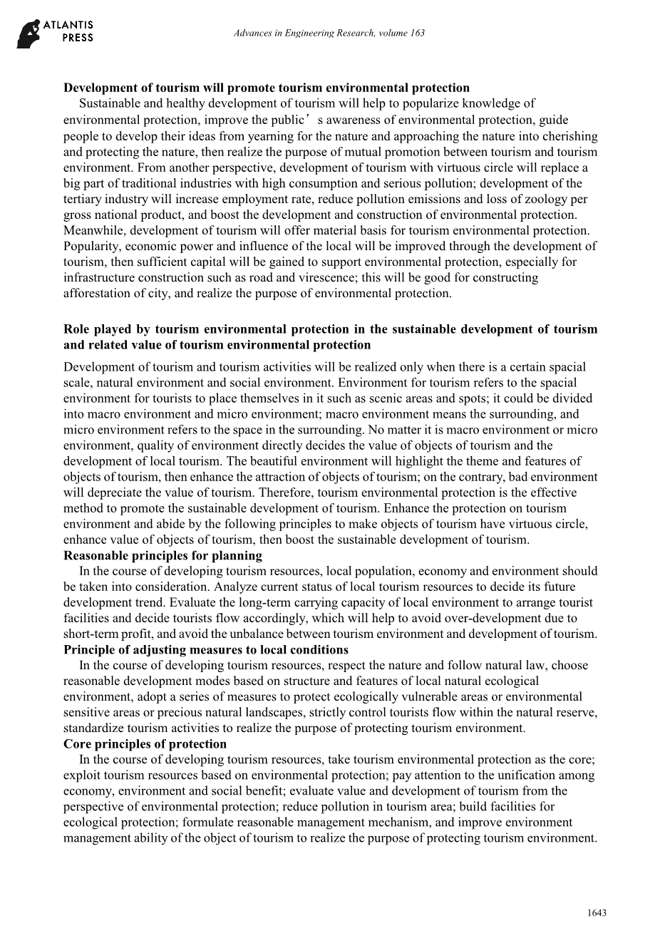 在开发旅游资源的过程中,当地人口,经济和环境应被考虑在内。 分析当地旅游资源的现状,以决定其未来发展趋势。 评估当地环境对游客的长期承载能力设施,并相应地决定游客流量,这将有助于避免因短期利益,避免旅游环境与旅游发展之间的不平衡。