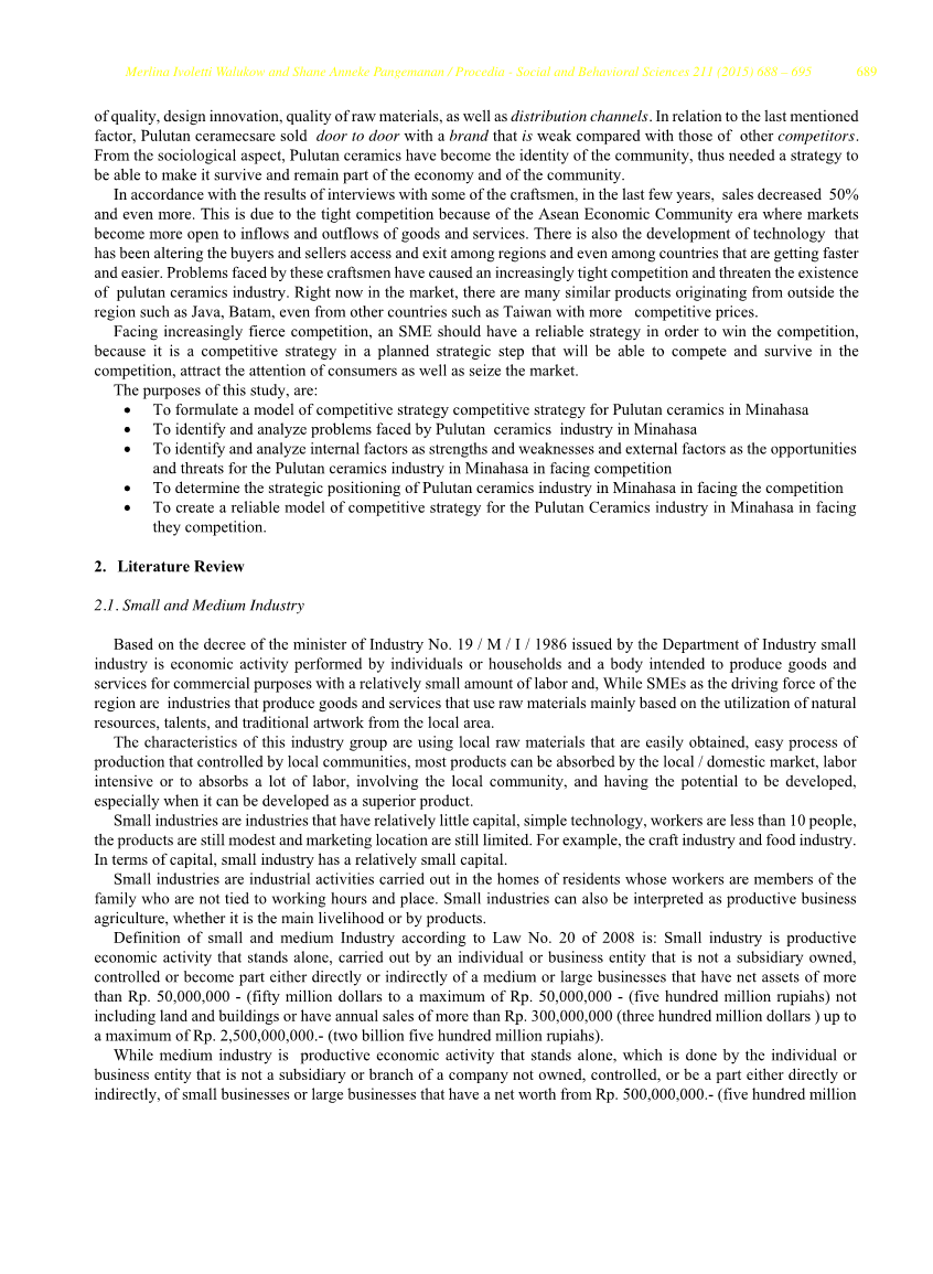 选择定性方法作为研究方法。将通过访谈过程向研究的受访者描述性地介绍这项研究的结果。这项研究是在米纳哈萨的普鲁坦行政区进行的。研究的目的是为米纳哈萨的普鲁坦陶瓷中小型工业(SMI)陶瓷工艺普鲁坦开发竞争战略模型。在这项研究中,受访者是普鲁坦陶瓷工匠。在米纳哈萨拥有215个业务部门。根据Sugiyono(2008:117),人口是具有特定素质和特征的对象,这是研究人员确定的要研究的结论。而样本是该种群拥有的数量和特征的一部分。