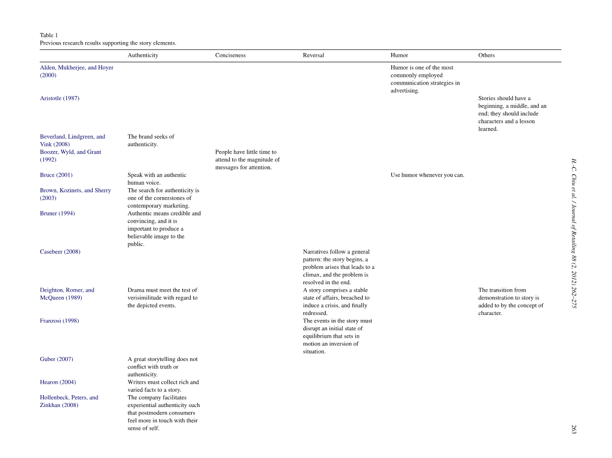 在以前的文献中(见表1),几个因素代表着一个故事的前提。没有按时间顺序或中心人物等因素,它不被称为故事(Deighton,Romer和McQueen 1989)。几个因素也反映出观众对故事的反应,例如图像和汲取的教训。因此,根据相关的相关文献,这项研究着重介绍了促成良好品牌故事的四个要素:真实性(即,对行为和具体语言的使用进行可视化,从而使读者联想到现实或使其可信; Beltramini 1982); Deighton,Romer和McQueen 1989),简洁(或简洁; Reinstein和Trebby 1997),逆转(即主角面临严重障碍,但找到了解决方案;Casebeer 2008)和幽默感(即有趣的环境; Bruce 2001)。