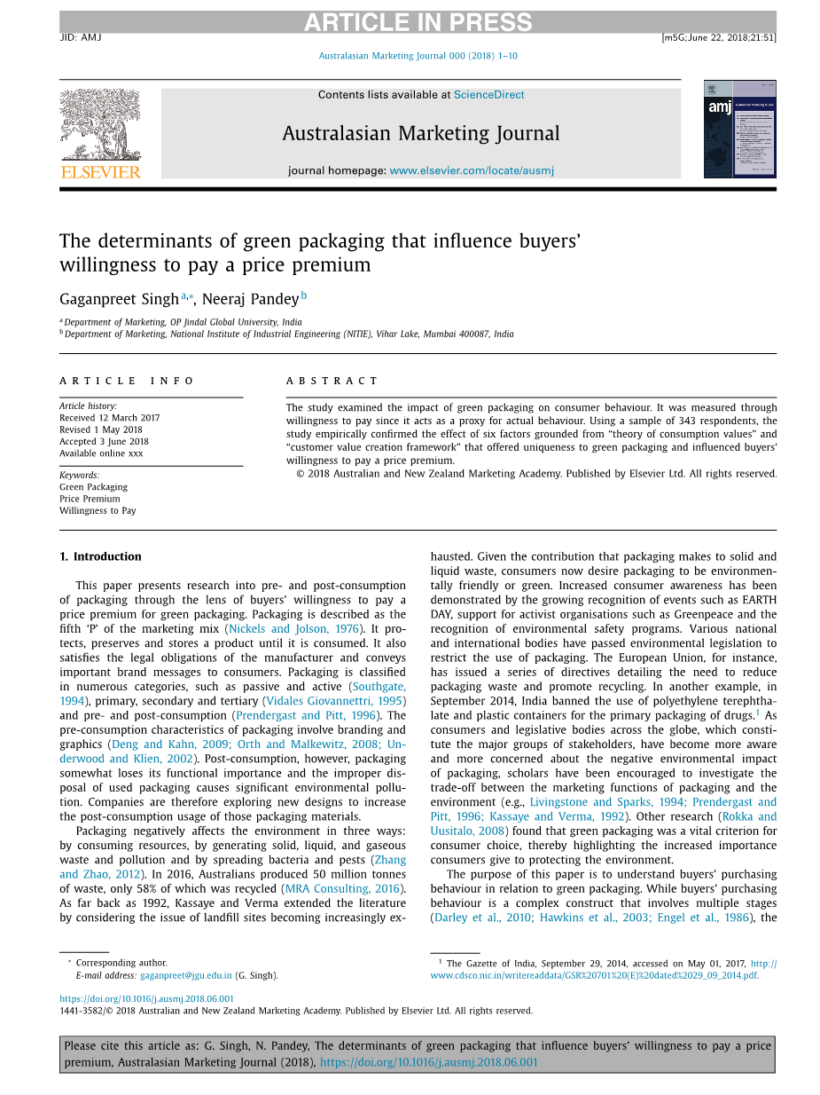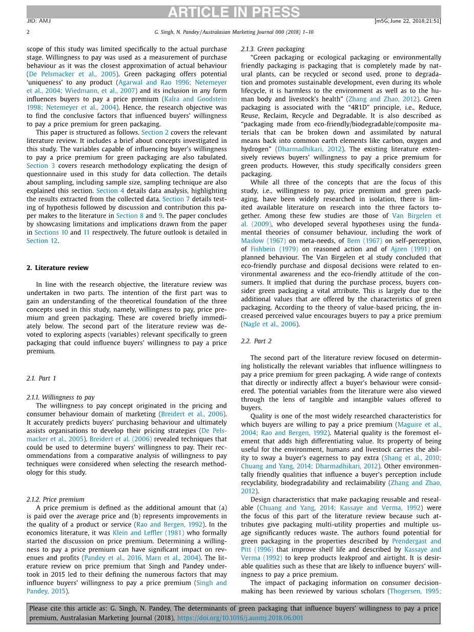 本文旨在了解消费者对绿色包装的购买行为。虽然购买者的购买行为是一个复杂的结构,涉及多个阶段(Darley等人,2010年;Hawkins等人,2003年;Engel等人,1986年),但是本研究的范围仅限于实际购买阶段。支付意愿被用来衡量购买行为,因为它最接近实际行为(De Pelsmacker等人,2005年)。绿色包装为任何产品(Agarwal and Rao 1996;Netemeyer et al.,2004;Wiedmann et al.,2007)提供了潜在的“独特性”,并以任何形式将其包含在内,从而影响买家支付价格溢价(Kalla and Goodstein 1998;Netemeyer et al.,2004)。因此,本研究的目的是找出影响购买者购买绿色包装的价格溢价意愿的决定性因素。