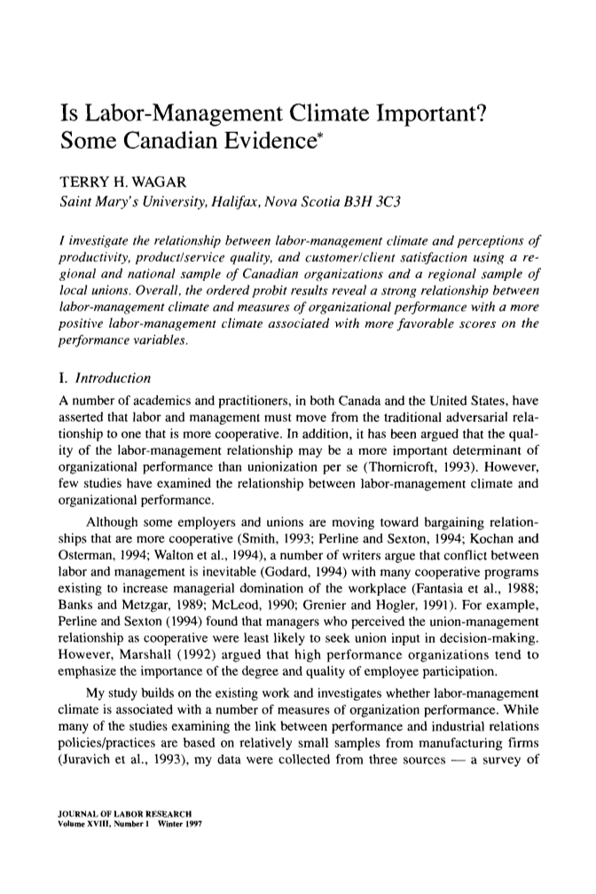 加拿大和美国的一些学者和实践者都断言,劳资双方必须从传统的敌对关系转向一种更具合作性的关系。此外,有人认为劳资关系的质量可能比工会组织本身更重要地决定组织绩效(Thornicroft, 1993)。然而,很少有研究探讨劳动管理气氛与组织绩效之间的关系。
