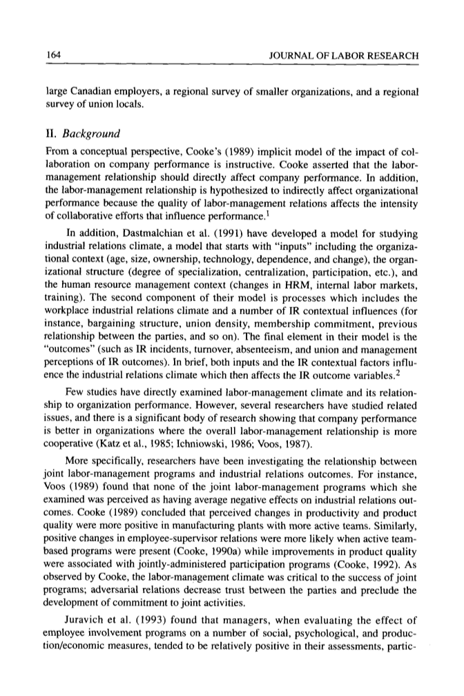 研究人员最近开发和测试了一些量表来考察劳动或劳资关系的气候(Hammer et al., 199 l;Dastmalchian等,1991;Huszczo和Hoyer, 1994)。然而,尽管人们对研究员工参与与组织绩效之间的联系越来越感兴趣,Bruning et al.(1994)观察到关于劳动力管理环境对组织的影响的实证证据很少(有些例外包括Katz et al., 1983;安格尔和佩里,1986年;Dastmalchian等,1991)。