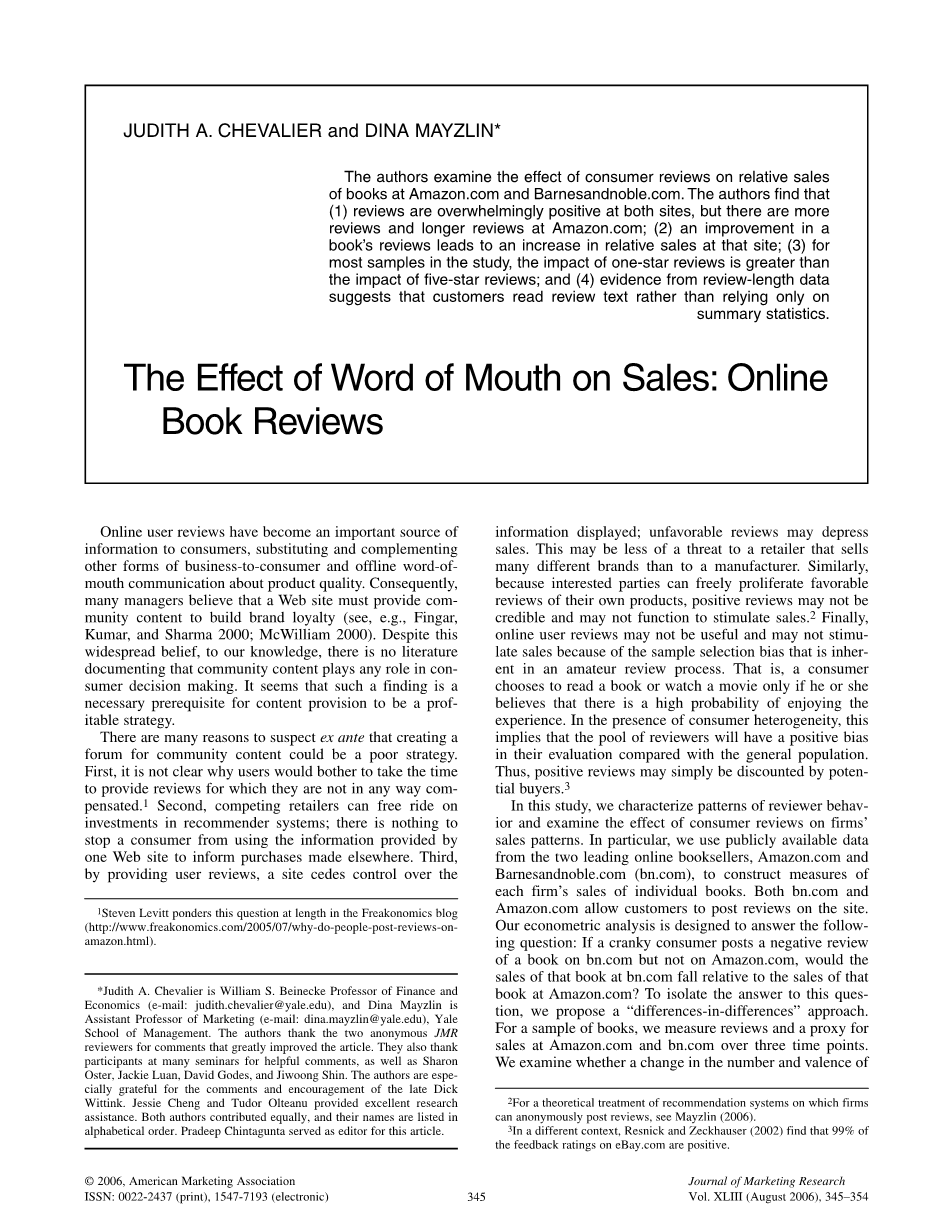 在这项研究中,我们表征了评论者行为的模式,并研究了消费者评论对公司销售模式的影响。尤其是,我们使用来自两家领先的在线书商Amazon.com和Barnesandnoble.com(bn.com)的公开数据来构建对每个公司单本书销量的衡量指标。 bn.com和Amazon.com都允许客户在网站上发布评论。我们的计量经济学分析旨在回答以下问题:如果一个狂妄的消费者在bn.com上发布了对某本书的否定评论,但在Amazon.com上却对该书的否定评论,则该书在bn.com上的销量相对于销量会下降吗?在Amazon.com上买到的那本书?为了隔离对这个问题的答案,我们提出了“差异中的差异”方法。对于书籍样本,我们在三个时间点评估评论以及Amazon.com和bn.com上的销售代理。我们检查某个站点相对于另一个站点的特定书籍的评论数量和价位随时间的变化是否可以预测该书在一个站点相对于另一个站点的后续销售中的变化。通过关注两个站点上书籍的相对销售之间的差异,我们能够控制未观察到的书籍特征对书评和销售的可能影响。通过关注不同时间点之间的差异,我们控制了两个位置的顾客群体之间的口味差异可能会同时影响评论和销量的可能性。