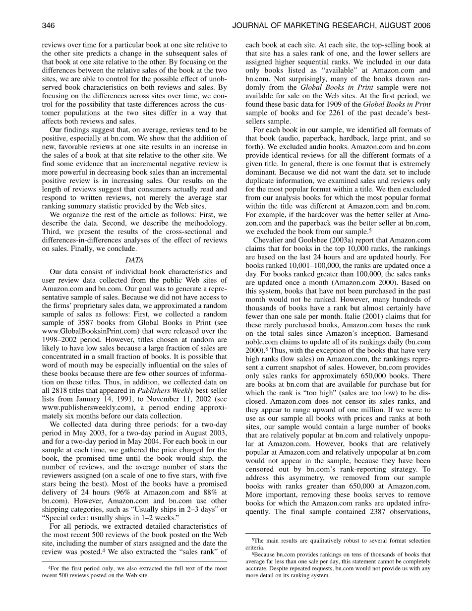 Chevalier and Goolsbee(2003a)报告说,Amazon.com声称,对于排名前10,000的图书,排名基于最近24小时,并且每小时更新一次。对于排名在10,001–100,000之间的图书,排名每天更新一次。对于排名大于100,000的图书,销售排名每月更新一次(Amazon.com 2000)。基于此系统,将不会对上个月未购买的书籍进行排名。但是,成千上万的书籍具有一定的排名,但几乎可以肯定每个月的销量少于一本书。Italie(2001)声称,对于这些鲜有购买的图书,Amazon.com根据自亚马逊成立以来的总销量排名。Barnesandnoble.com声称每天都会更新其所有排名(bn.com 2000)。因此,除了在Amazon.com上具有很高排名(低销量)的图书以外,该排名代表了当前销售快照。但是,bn.com仅提供约650,000本书的销售排名。bn.com上有一些书籍可以购买,但其等级“太高”(销售太低)而无法公开。Amazon.com并未审查其销售排名,它们的排名似乎超过一百万。如果我们使用两个站点上所有价格和排名的图书作为样本,我们的样本将包含大量在bn.com上相对流行而在Amazon.com上相对不受欢迎的图书。但是,在样本中不会出现在Amazon.com上相对流行但在bn.com上相对不受欢迎的书籍,因为这些书籍已被bn.com的排名报告策略所审查。为了解决这种不对称问题,我们从Amazon.com上排名超过650,000的样本书中删除了该书。更重要的是,删除这些书是为了删除Amazon.com排名不经常更新的书。最终样本包含2387个观测值,其中有1087个评价是在第一个时间点(2003年5月)在两个站点上发布的。