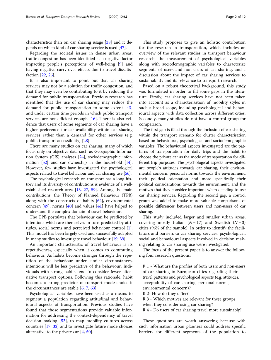 本研究旨在为交通研究做出整体贡献,其中包括交通行为研究的相关研究概述、心理变量测量以及社会人口变量,以描述汽车共享的用户和非用户群体,并讨论汽车共享服务对可持续性的影响及其与交通研究的相关性。